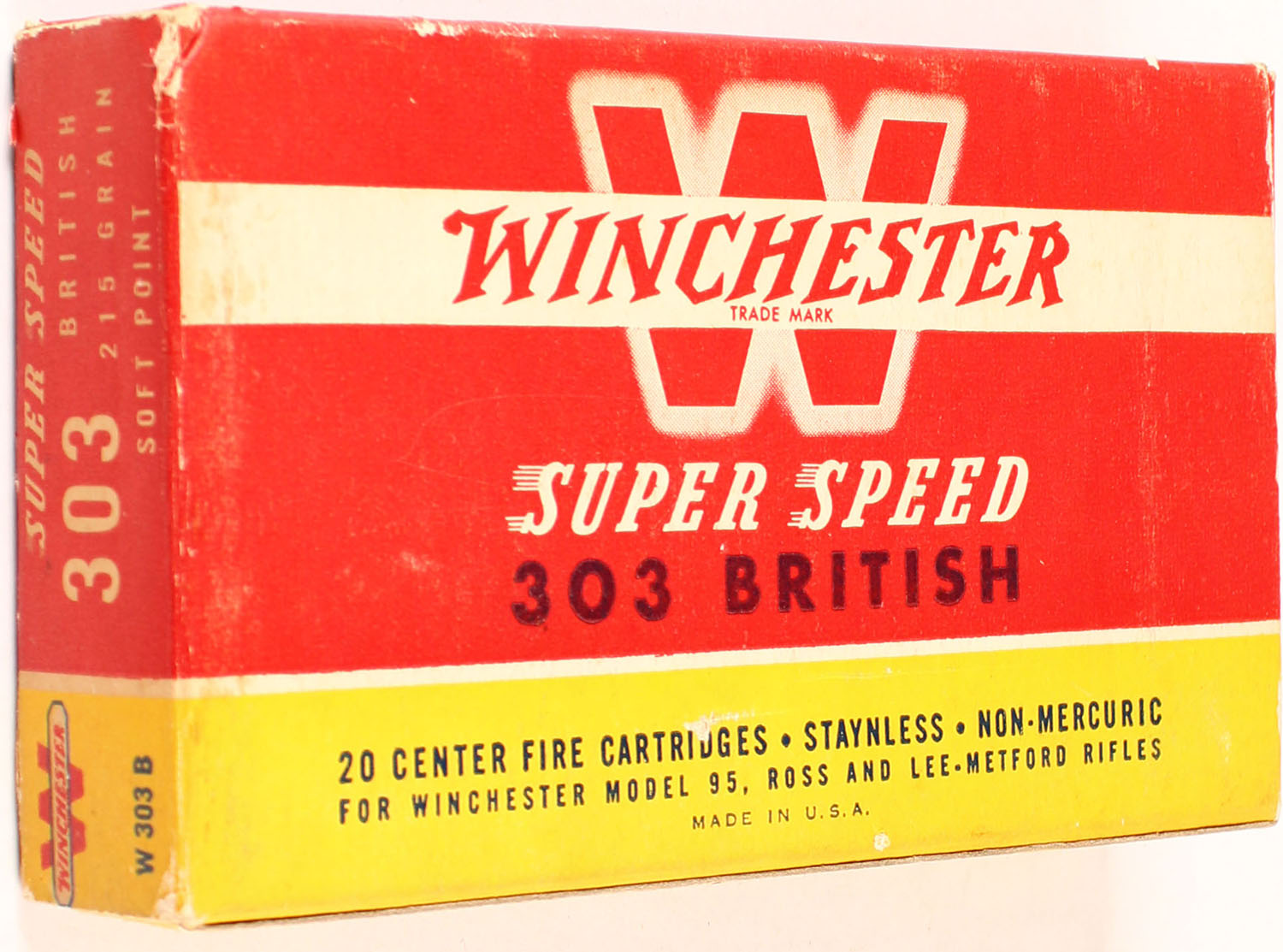 Winchester, Super Speed, .303 British, 215 Grain Soft Point, Full, 1pc. Red yellow & white box, box is solid with excellent color, minor age soiling, very minor corner & edge wear, end flaps are solid, ammo is excellent. Grade: Excellent + - Value: 20 to 60