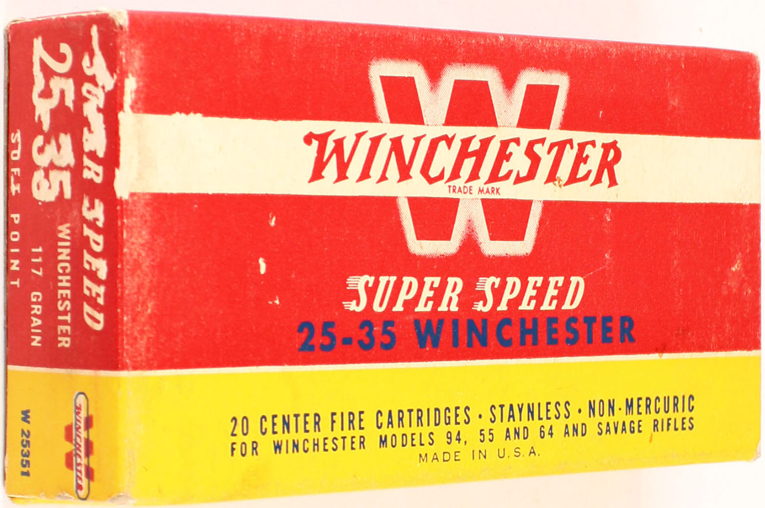 Winchester, Super Speed, .25-35 Winchester, 117 Grain Soft Point, Full, 1pc. Red yellow & white box, box is solid with very good to excellent color, some age soiling, minor shelf & corner wear, edges are mostly crisp, end flaps are solid, ammo is excellent. Grade: Excellent + - Value: 20 to 60