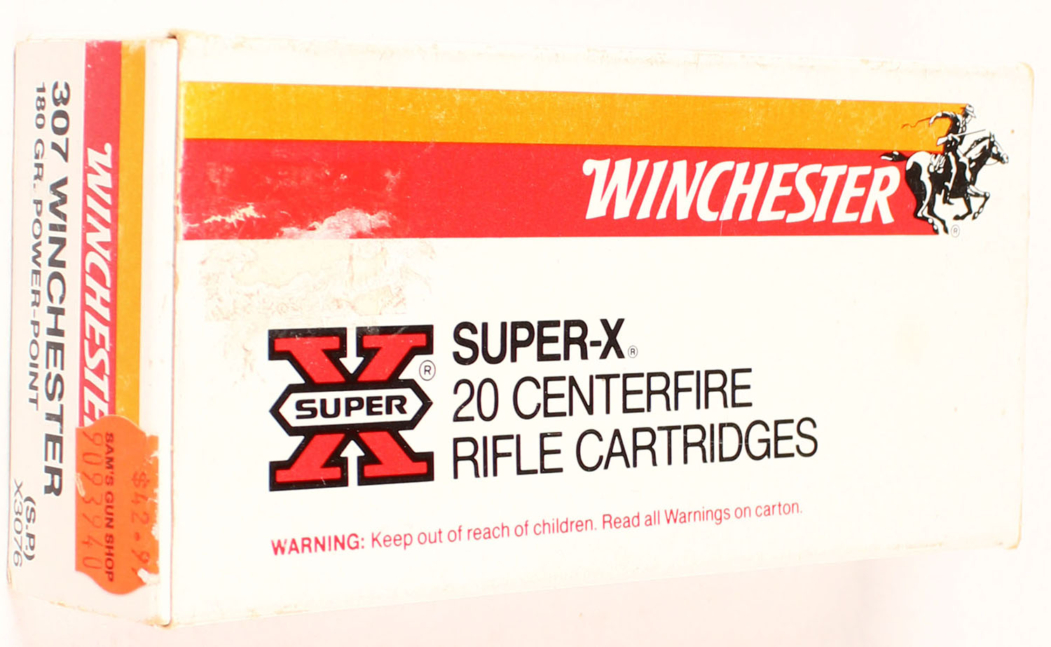 Winchester, Super-X, 307 Winchester, 180 Grain Power-point SP, Full, 1pc., Multi-colored box, box is solid with great color, Ammo is excellent. Grade: Excellent ++ - Value: 20 to 80
