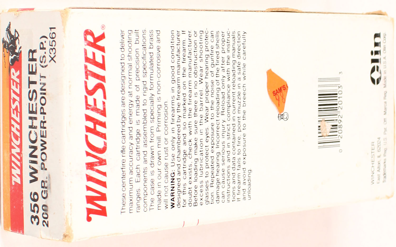 Winchester, Super-X, 356 Winchester, 200 Grain Power-point SP, Full, 1pc., Multi-colored box, box is solid with great color, Ammo is excellent. Grade: Excellent ++ - Value: 20 to 80