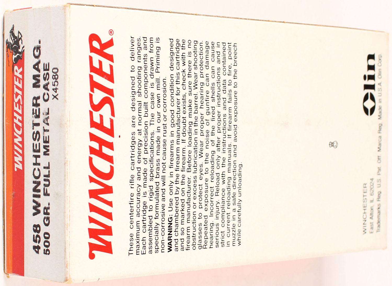 Winchester, Super-X, 458 Winchester Mag, 500 Grain Full Metal Case, Full, 1pc., Multi-colored box, box is solid with great color, Ammo is excellent. Grade: Excellent ++ - Value: 20 to 80