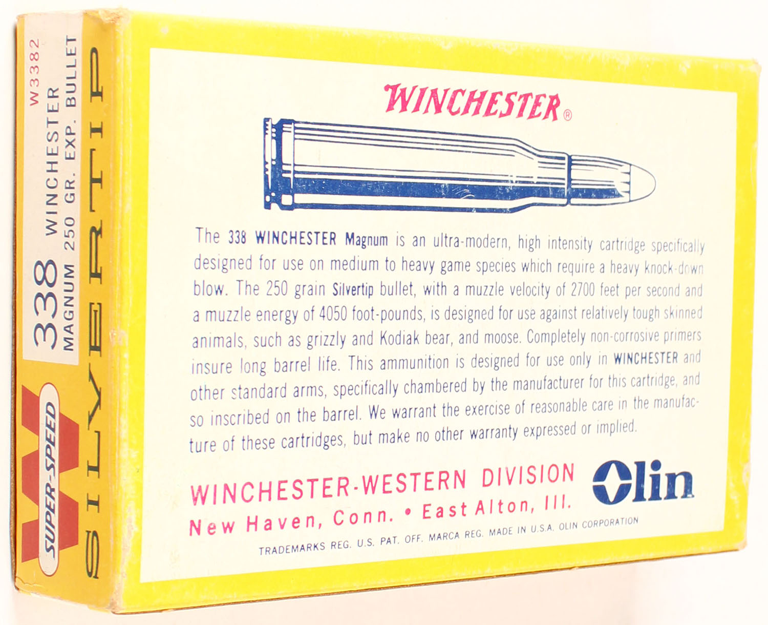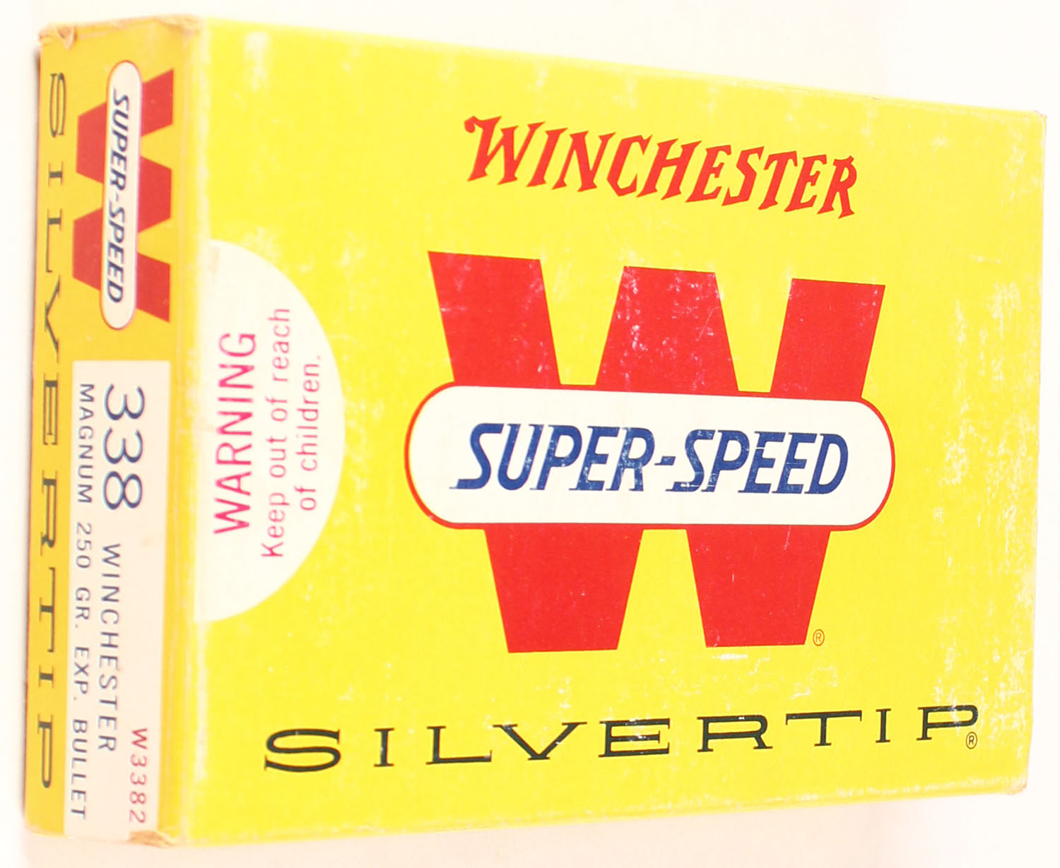 Winchester, Super Speed, 338 Winchester Magnum, 250 Grain Silvertip EXP, Full, 1pc., Multi-colored box, box is solid with great color, Ammo is excellent. Grade: Excellent ++ - Value: 20 to 80