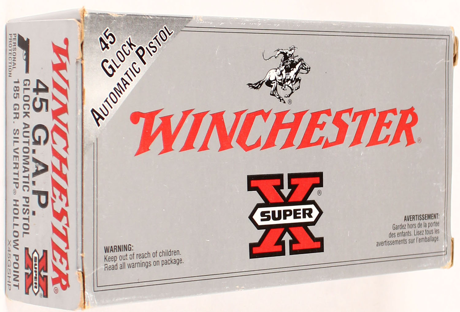Winchester, Super-X, 45 G.A.P, 185 Grain Silvertip HP, Full, 1pc., Multi-colored box, box is solid with great color, Ammo is excellent. Grade: Excellent ++ - Value: 20 to 80