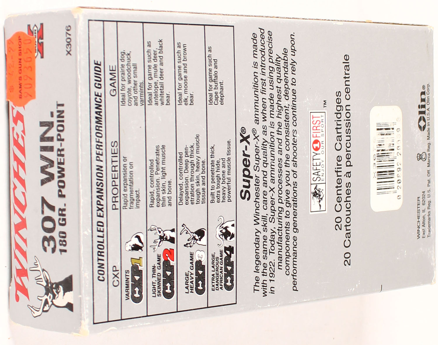 Winchester, Super-X, 307 Win, 180 Grain Power-Point, Full, 1pc., Multi-colored box, box is solid with great color, Ammo is excellent. Grade: Excellent + - Value: 20 to 80