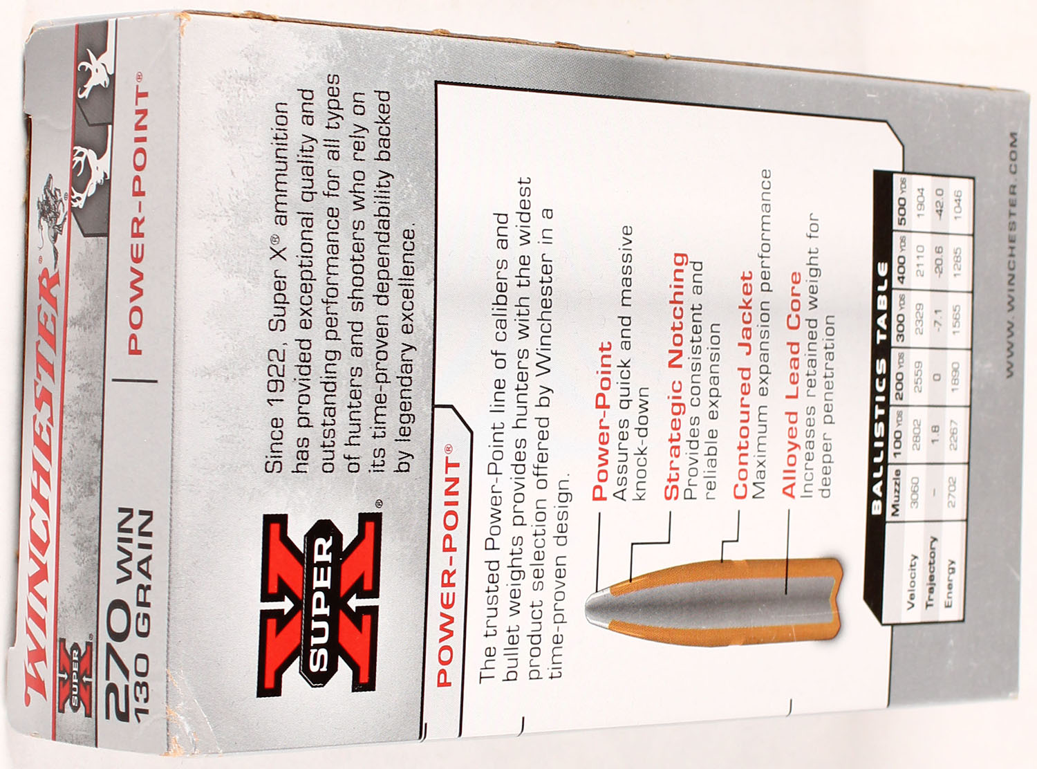 Winchester, Super-X, 270 Win, 130 Grain Power-Point, Full, 1pc., Multi-colored box, box is solid with great color, Ammo is excellent. Grade: Excellent + - Value: 20 to 80