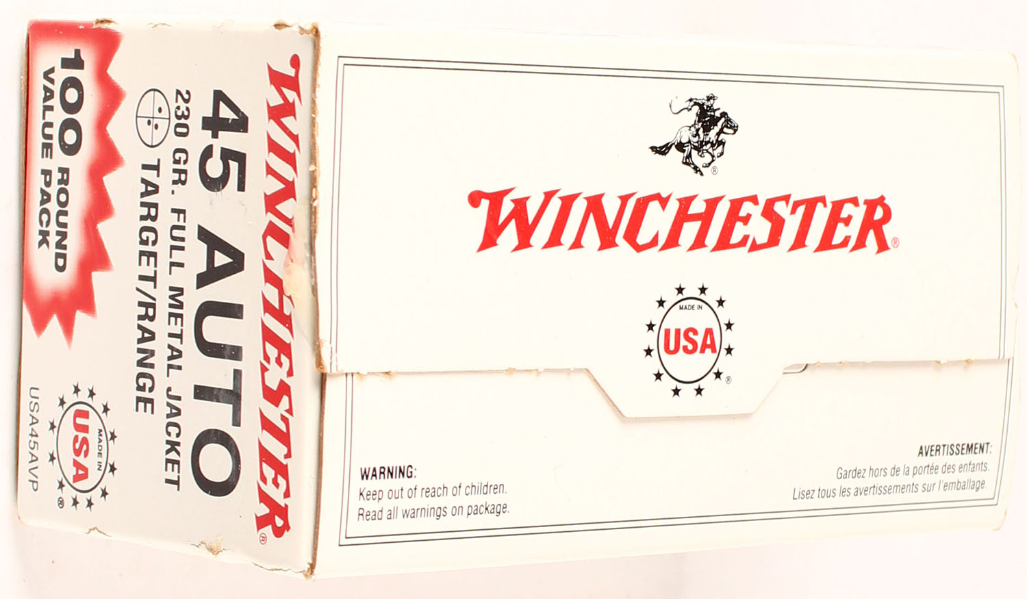 Winchester, 45 Auto, 230 Grain FMJ, FULL & SEALED, 1pc., Multi-colored box, box is solid with great color, Ammo is excellent. Grade: Excellent + - Value: 20 to 80