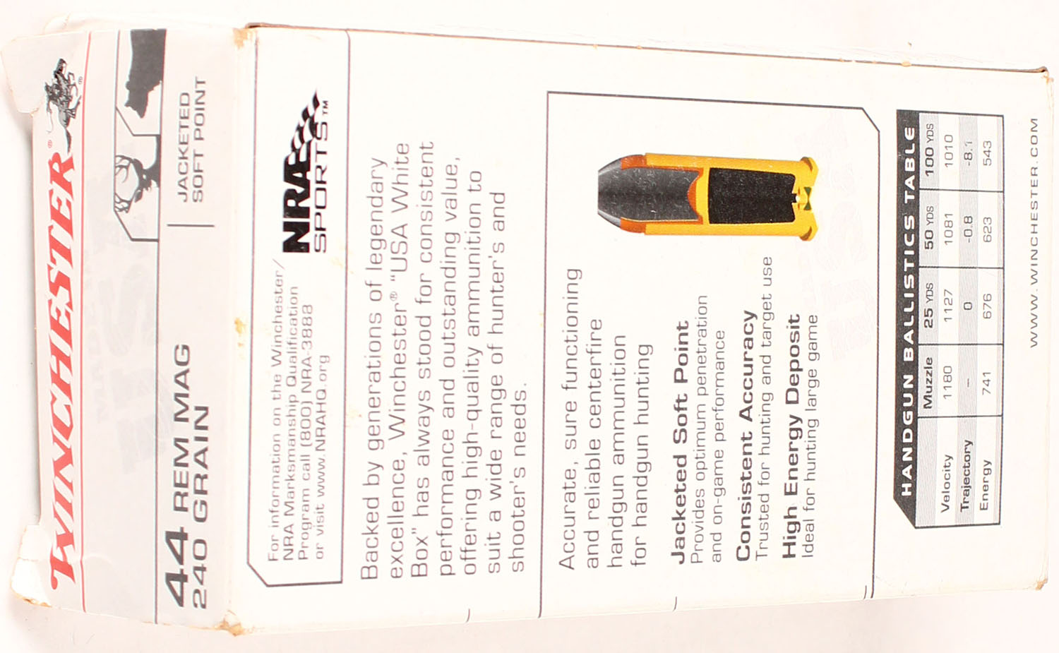 Winchester, 44 Rem Mag, 240 Grain Jacketed Soft Point, Full, 1pc., Multi-colored box, box is solid with great color, Ammo is excellent. Grade: Excellent + - Value: 20 to 80