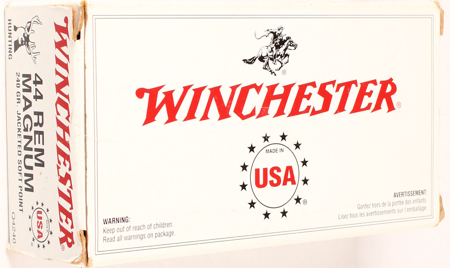 Winchester, 44 Rem Mag, 240 Grain Jacketed Soft Point, Full, 1pc., Multi-colored box, box is solid with great color, Ammo is excellent. Grade: Excellent + - Value: 20 to 80