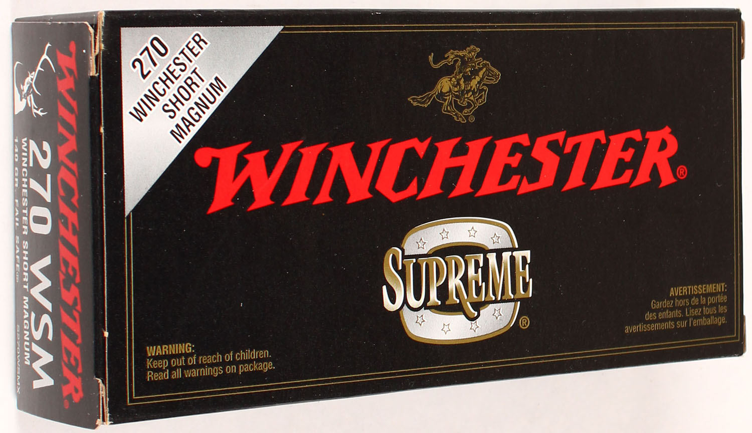Winchester, Supreme, 270 WSM, 140 Grain Fail Safe, Full, 1pc., Multi-colored box, box is solid with great color, Ammo is excellent. Grade: Excellent + - Value: 20 to 80
