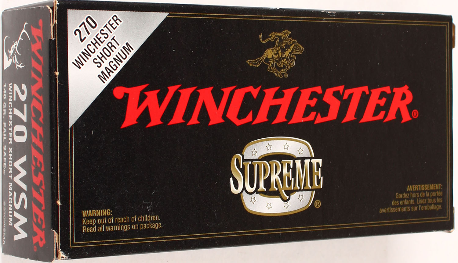 Winchester, Supreme, 270 WSM, 140 Grain Fail Safe, Full, 1pc., Multi-colored box, box is solid with great color, Ammo is excellent. Grade: Excellent + - Value: 20 to 80