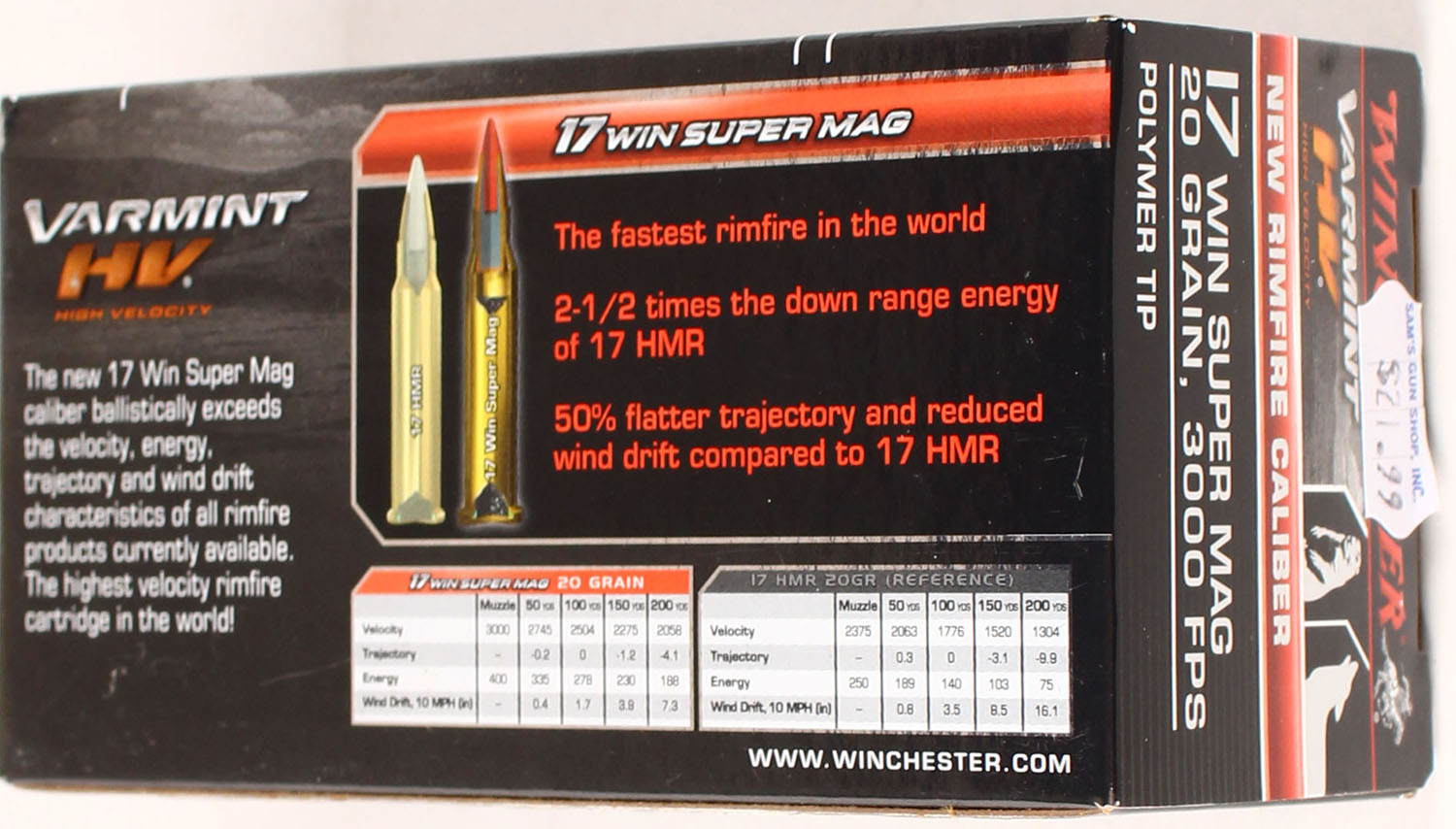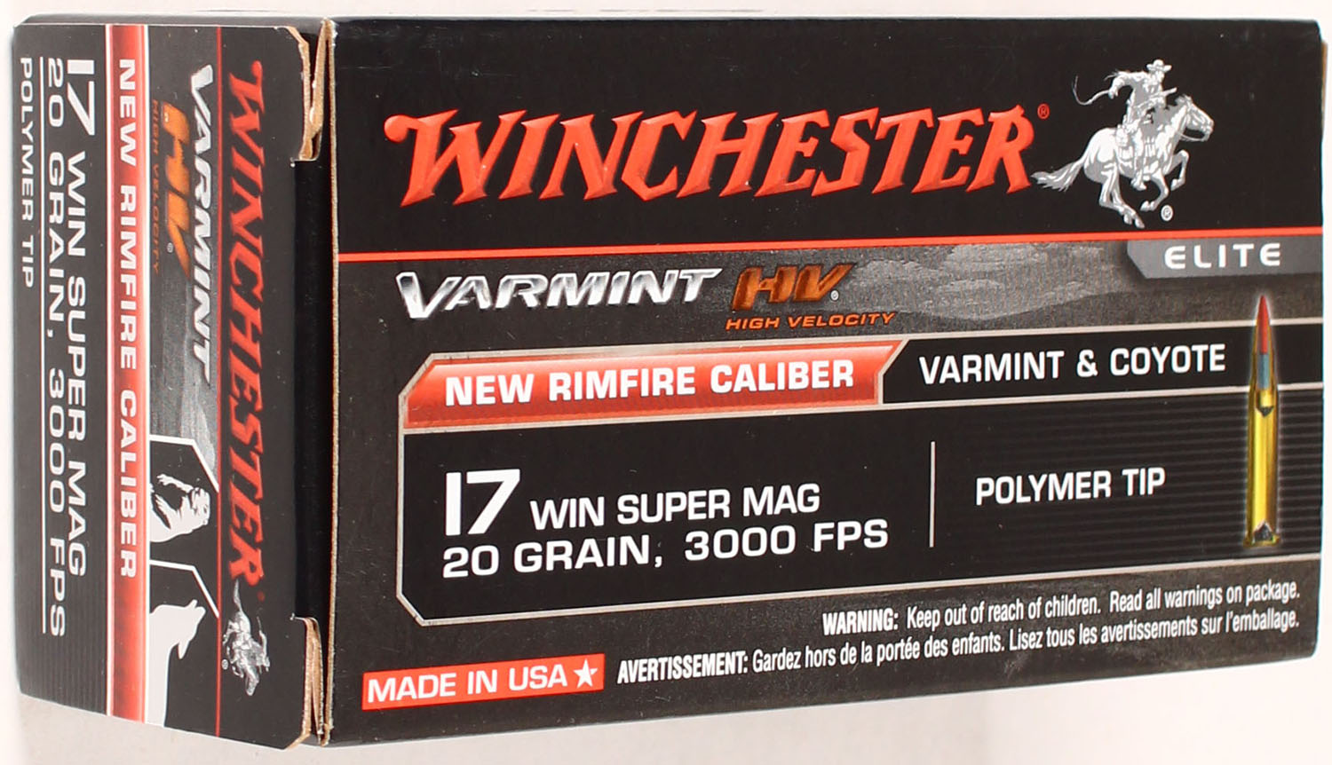 Winchester Elite, Varmint, 17 Win Super Mag, 20 Grain High Velocity Polymer Tip, Full, 1pc., Multi-colored box, box is solid with great color, Ammo is excellent. Grade: Excellent + - Value: 20 to 80