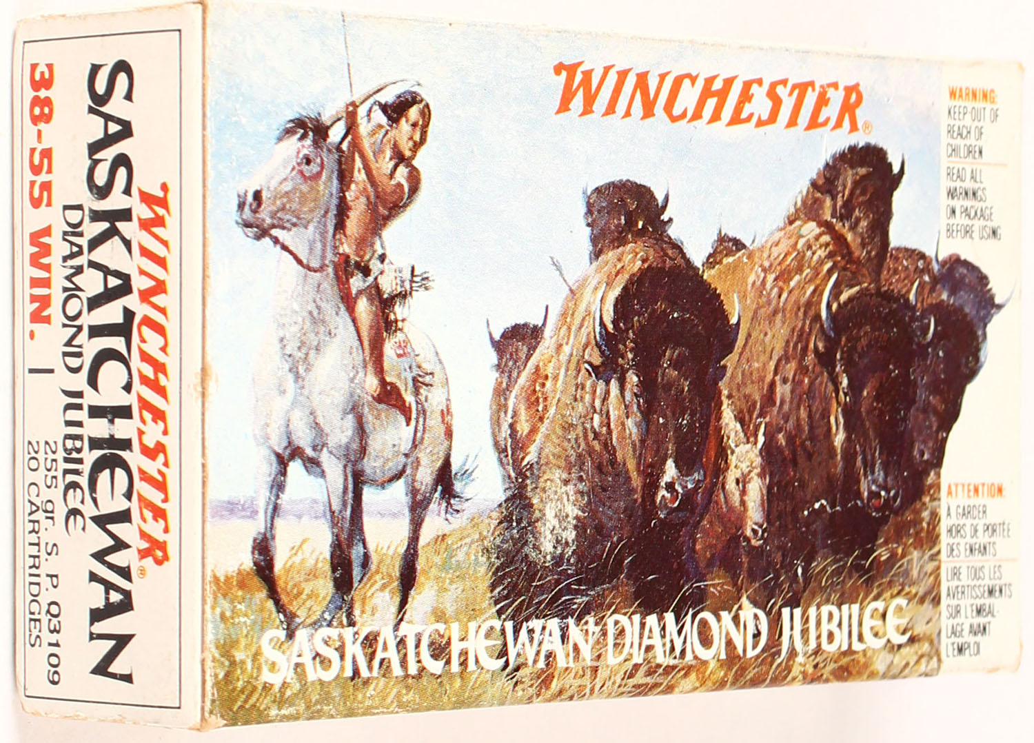 Winchester, Saskatchewan Diamond Jubilee, 38-55 Win, 255 Grain SP, Full, 1pc., Multi-colored box, box is solid with great color, Ammo is excellent. Grade: Excellent + - Value: 20 to 100