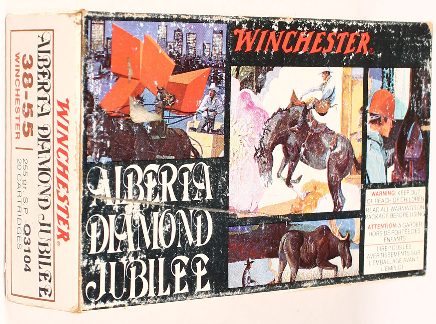 Winchester, Alberta Diamond Jubilee, 38-55 Win, 255 Grain SP, Full, 1pc., Multi-colored box, box is solid with great color, Ammo is excellent. Grade: Excellent + - Value: 20 to 100