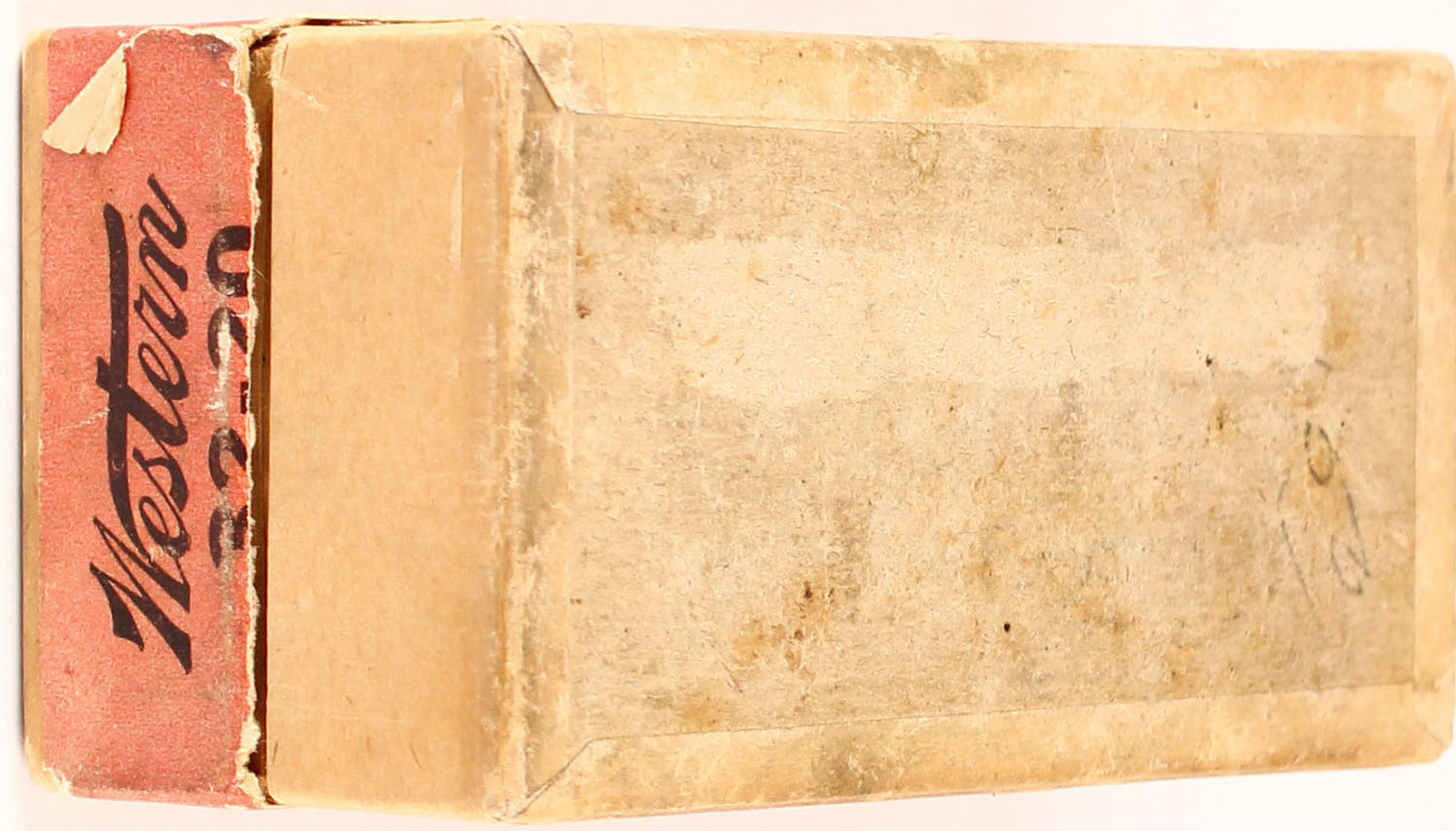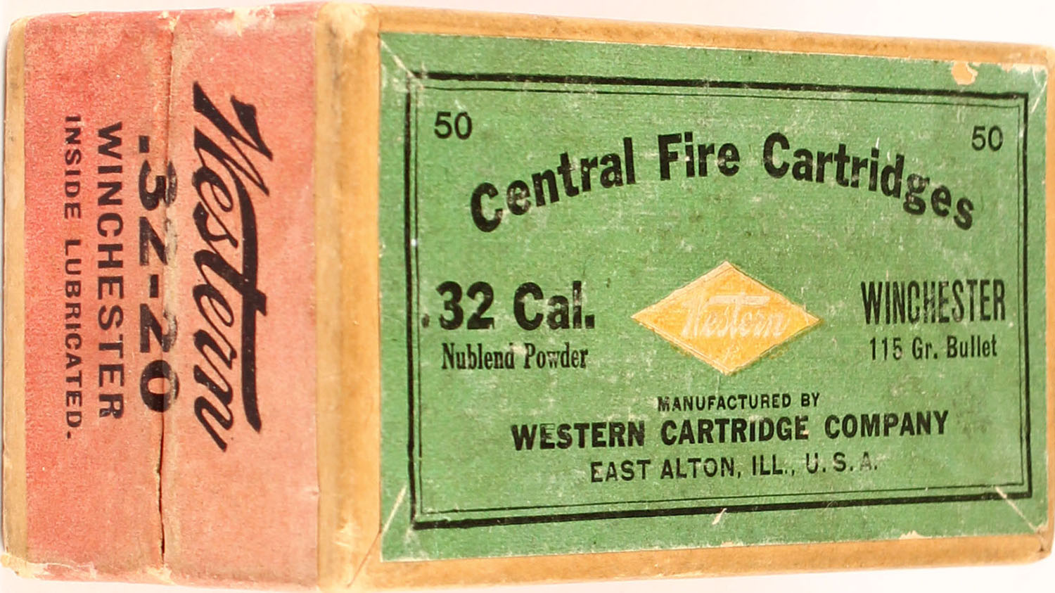 Western, .32-20 Winchester, 115 Gr. Inside lubricated Bullet, Nublend powder, 2pc, Full, buff box with green/red label & black print, box is solid with rub wear, light edge wear, & half of right end label missing, ammo is very good. Grade: Very Good ++ - Value: 40 to 120