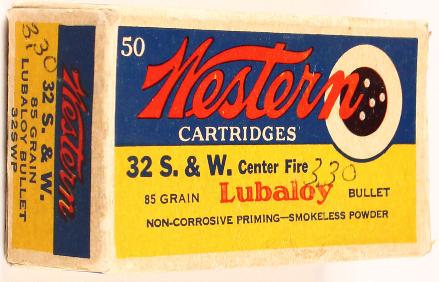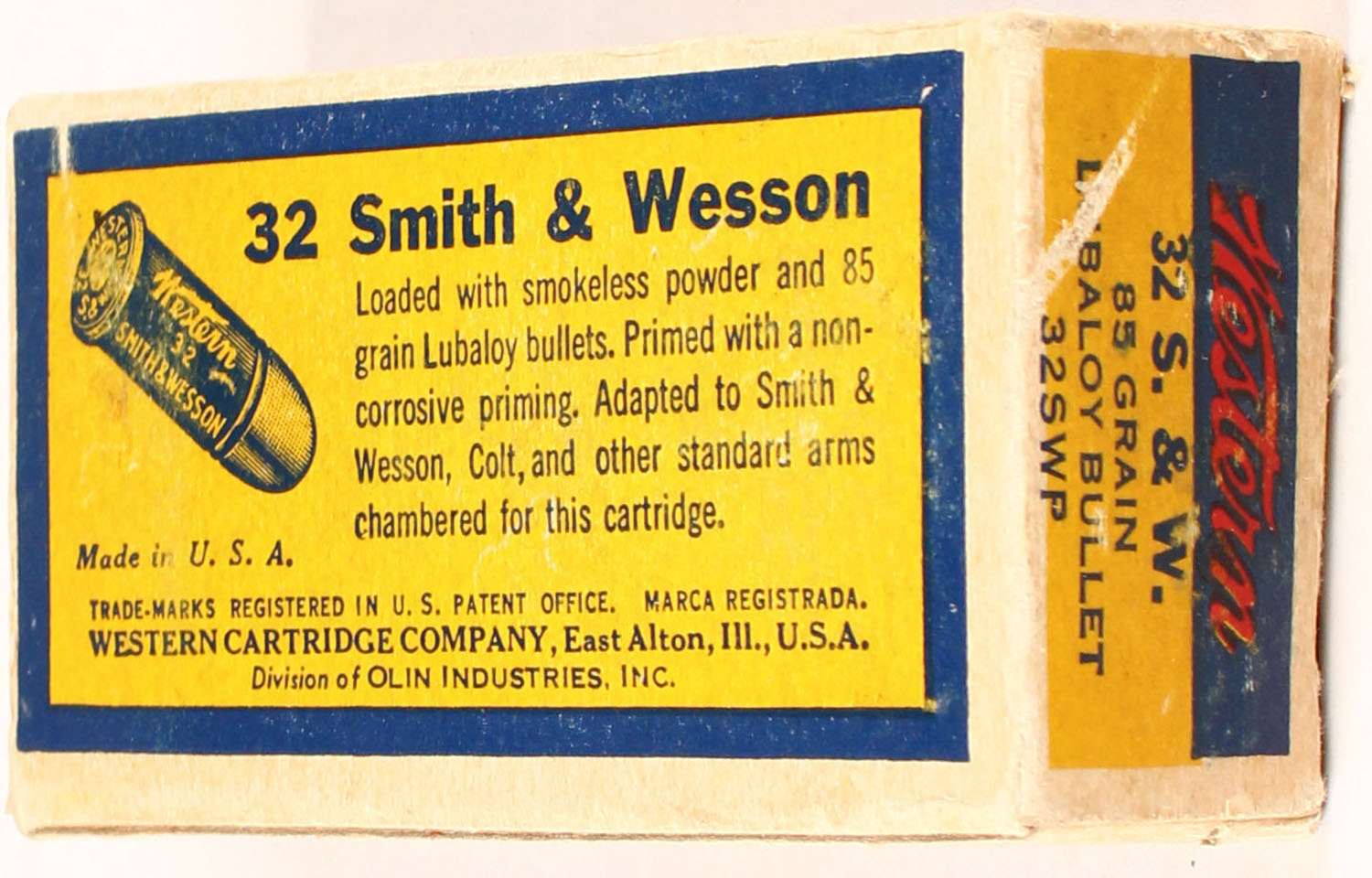 Western, .32 S&W, 85 Grain Lubaloy Bullet, FULL, 1Pc., Blue yellow & red bulls eye box, box has some scuffing, ammo is excellent. Grade: Excellent - Value: 20 to 80