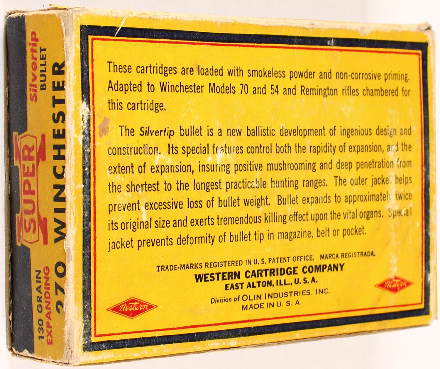 Western, Super-X, .270 Winchester, 130 Grain Silvertip Bullet, Controlled Expanding Bullet, Partial 10 rds., 1pc. Yellow blue & red Bear Box, box has scuffing and age soiling, ammo is very good. Grade: Very Good - Value: 6 to 60