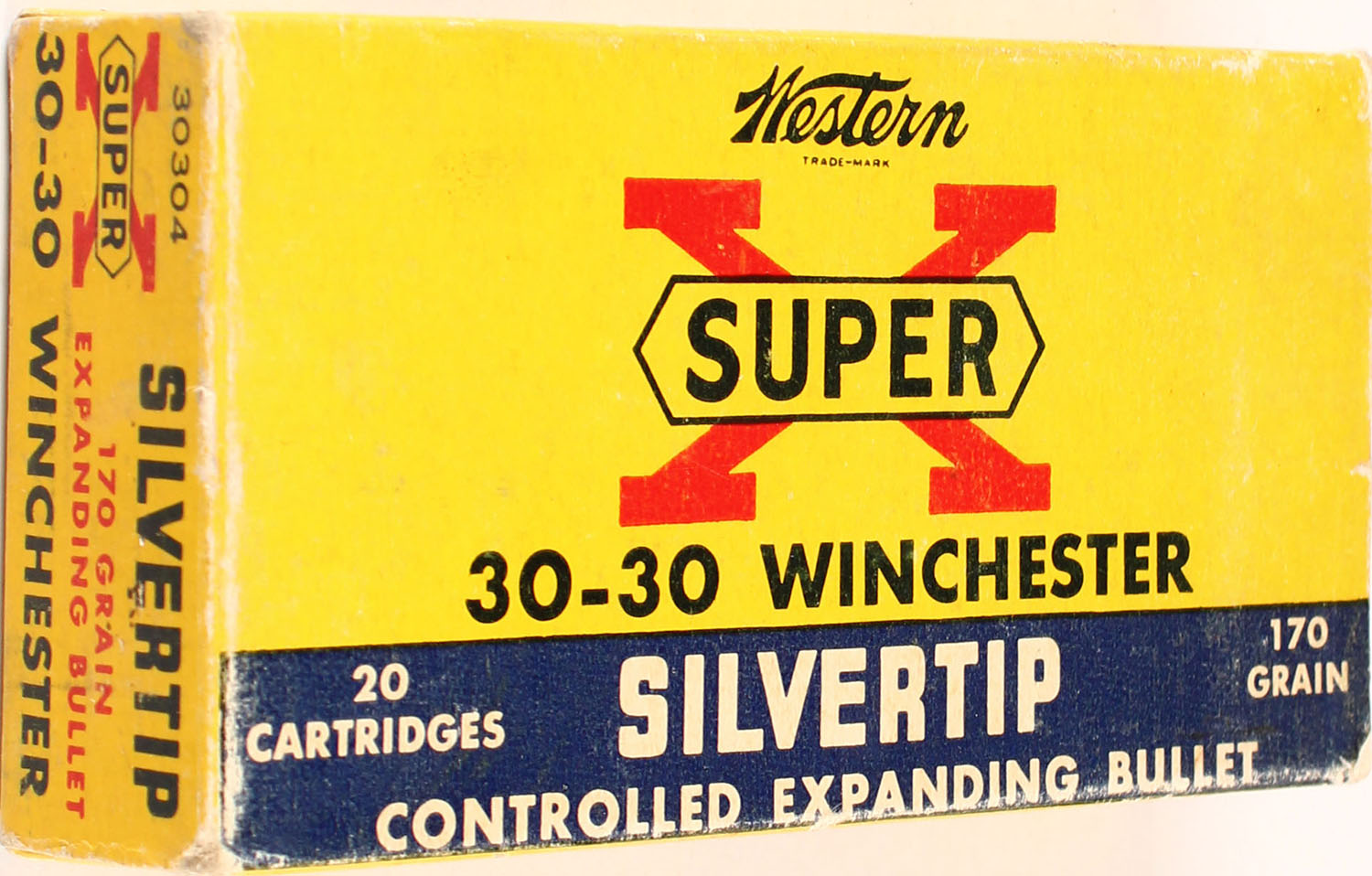 Western, Super-X, .30-30 Winchester, 170 Grain Silvertip Bullet, Controlled Expanding Bullet, Full, 1pc. Yellow blue & red Box, box has light scuffing, ammo is excellent. Grade: Excellent - Value: 30 to 90