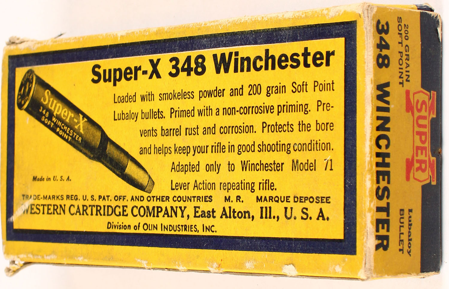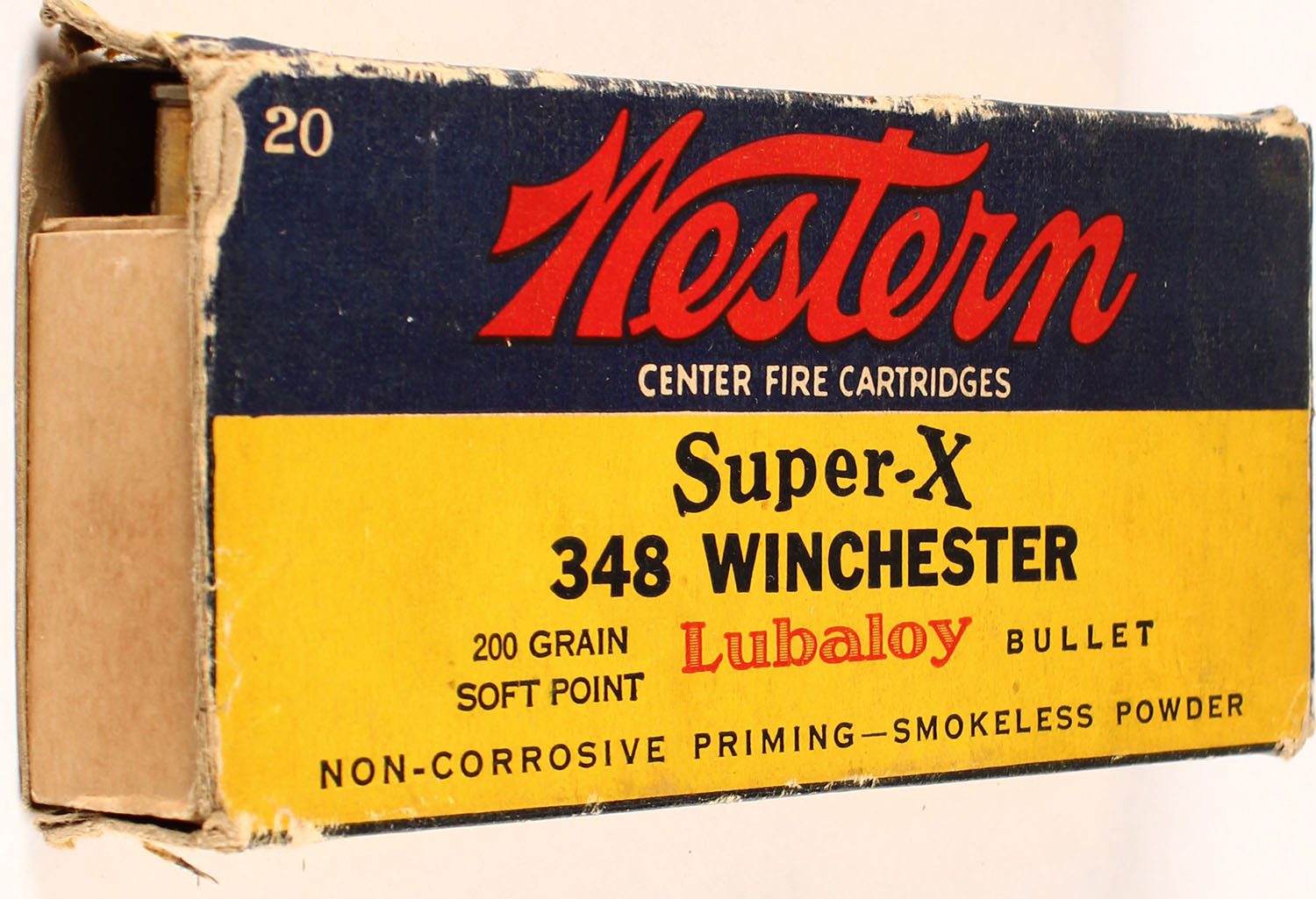 Western, Super-X, .348 Winchester, 200 Grain Lubaloy Bullet, Full, 1pc. Yellow blue & red box, box has 1 missing flap and has scuffing, ammo is excellent. Grade: Very Good + - Value: 50 to 200