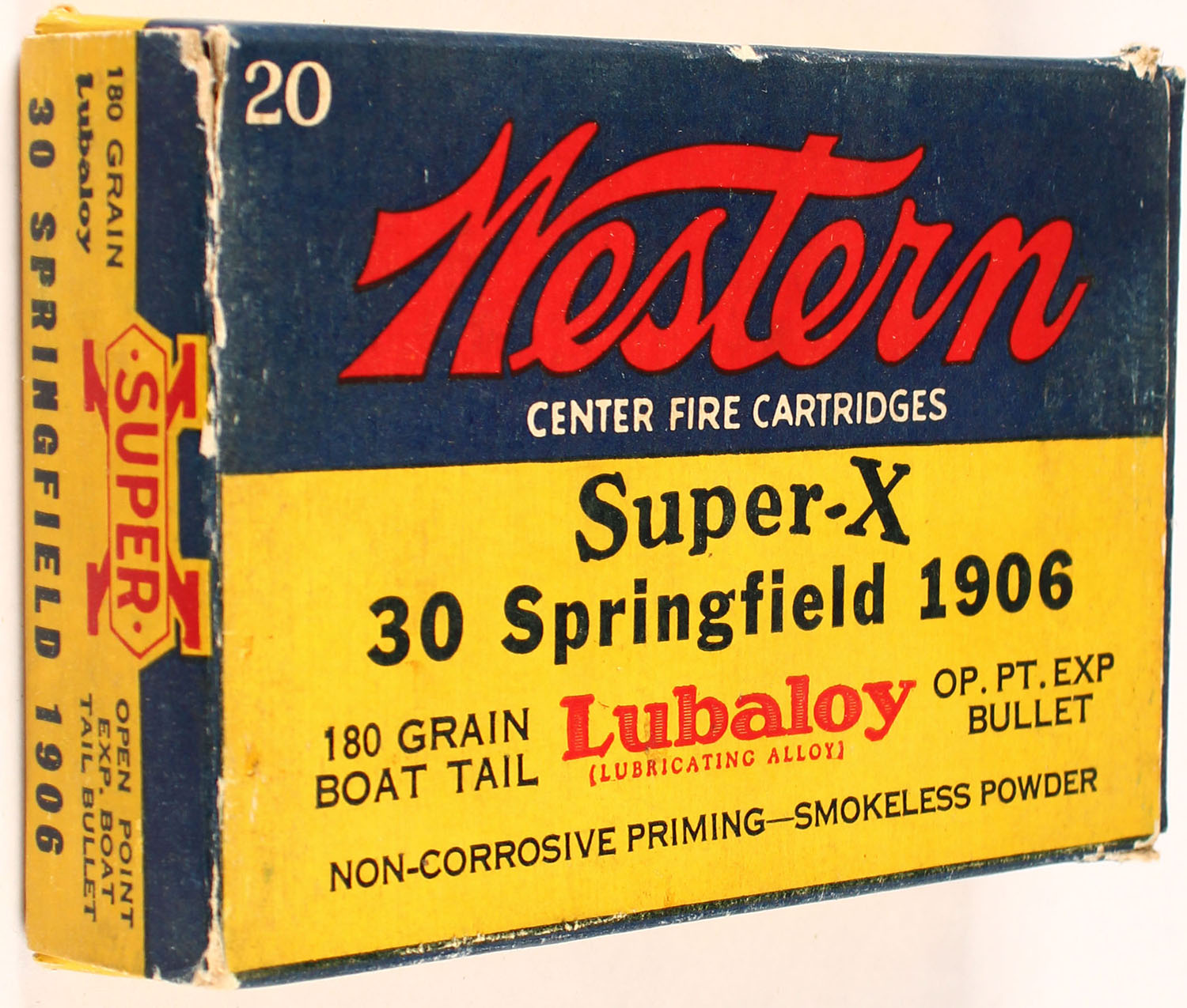 Western, Super-X, .30 Springfield 1906, 180 Grain Lubaloy Bullet, Full, 1pc. Yellow blue & red box, box is solid with scuffing, ammo is excellent. Grade: Excellent - Value: 40 to 100
