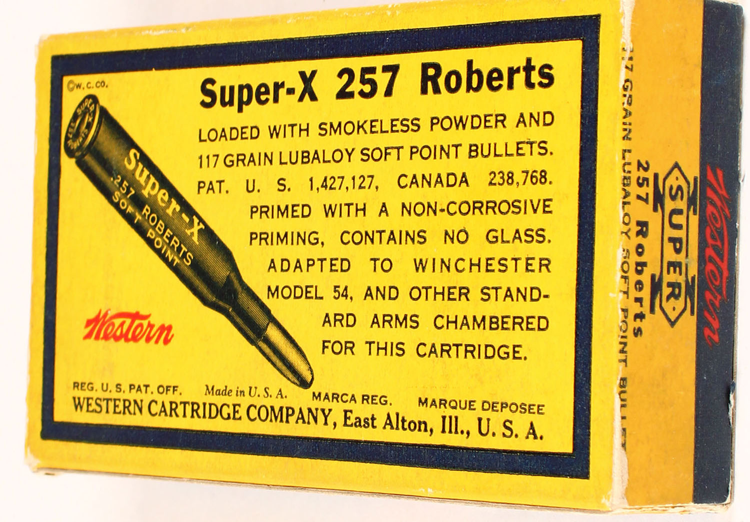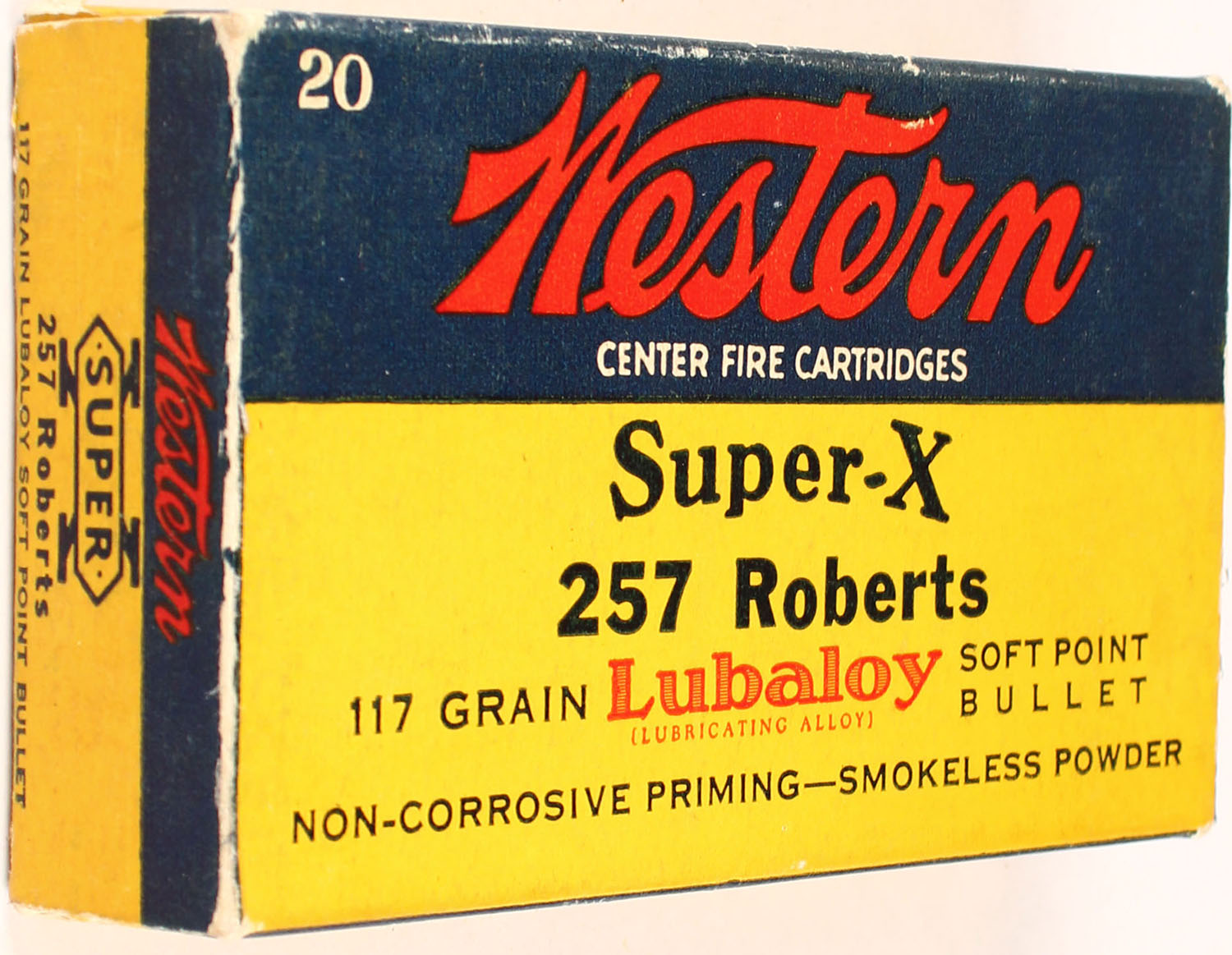 Western, Super-X, .257 Roberts, 117 Grain Lubaloy Bullet, Full, 1pc. Yellow blue & red box, box has scuffing, ammo is excellent. Grade: Excellent - Value: 40 to 150