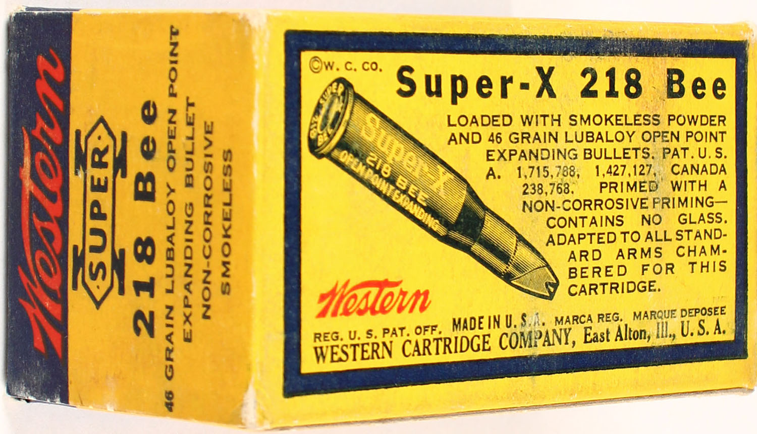 Western, Super-X, .218 Bee, 46 Gr. LUBALOY OP. PT. EXP. Bullet, Smokeless, 1pc, Full, blue/yellow box with black/red print, box is solid with rub marks, & light edge/corner wear, ammo is very good. Grade: Excellent - Value: 100 to 200