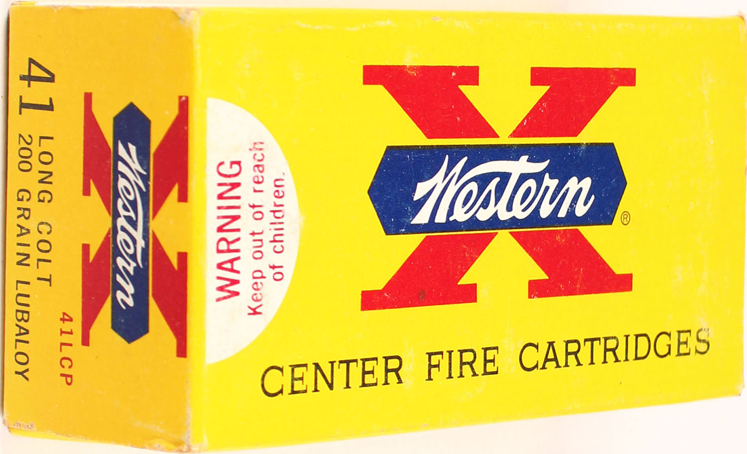 Western, Super-X, .41 Long Colt, 200 Gr. Lubaloy Inside lubricated Bullet, 1pc, Full, yellow box with white label & black/red/blue print, box is solid with light rub marks & very light corner wear, ammo is excellent Grade: Excellent + - Value: 100 to 200