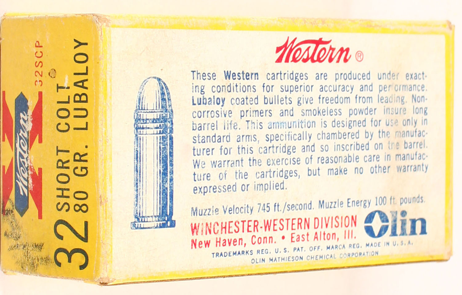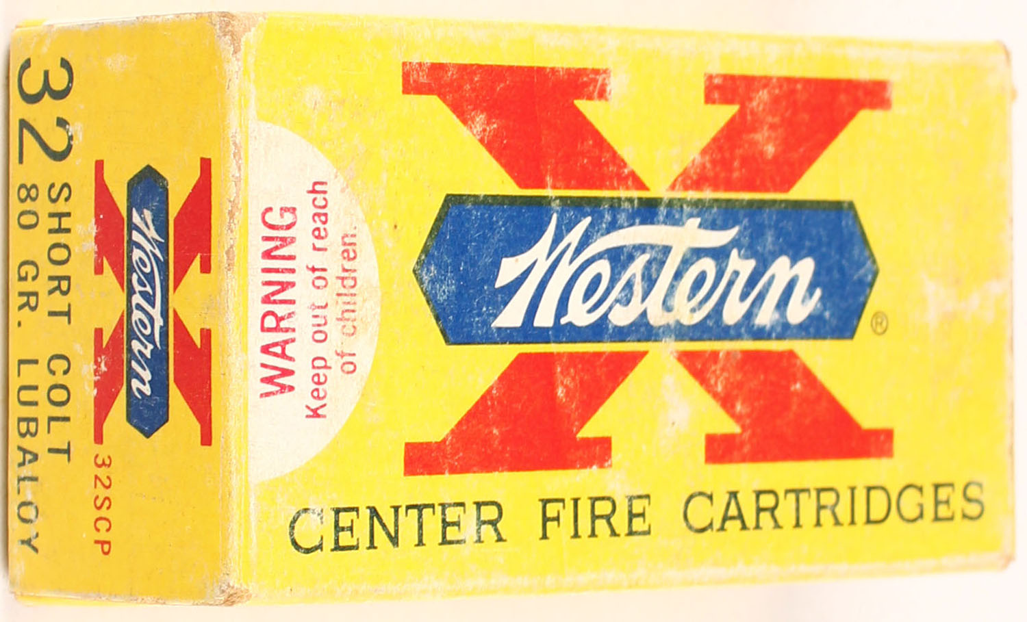 Western, Super-X, .32 Short Colt, 80 Gr. LUBALOY Bullet, 1pc, partial 46 Rds., yellow box with white label & black/red/blue print, box is solid with rub marks, & light edge/corner wear, ammo is very good. Grade: Very Good ++ - Value: 40 to 80