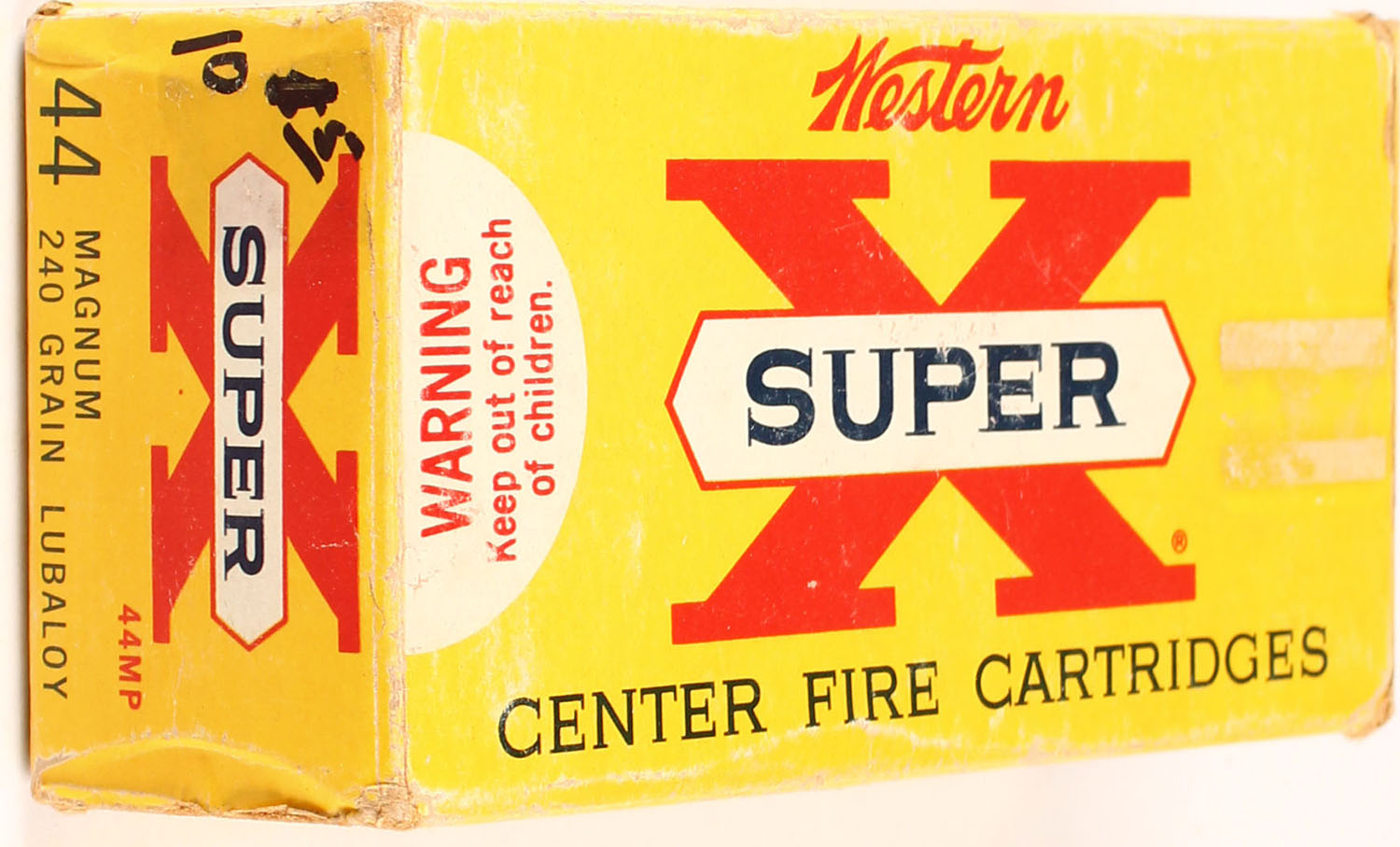Western, Super-X, .44 Magnum, .240 Gr. LUBALOY, Inside Lubricated, Gas Check Bullet, 1pc, Full, yellow box with white label & black/red print, box is solid with rub marks, edge wear, sticker marks, & pen marks, ammo is very good. Grade: Very Good + - Value: 30 to 60