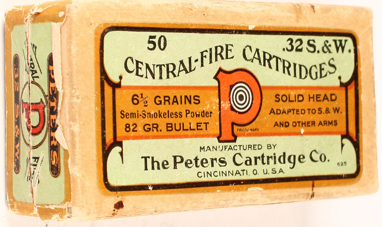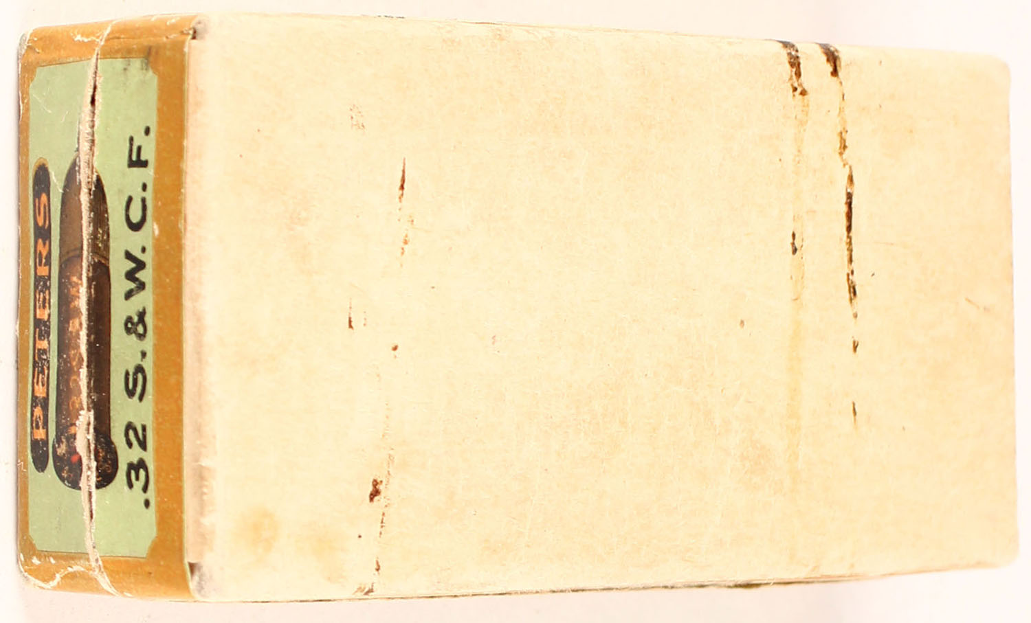 Peters, .32 S.&W. C.F. Rifle Cartridges, 82 Gr. Bullet, 6 1/2 Grs. of semi-smokeless powder, solid head, 2pc, Full, buff box with orange/green label & black/red print, box is solid with one split seam on lid, tears on back side of label, light rub marks & light edge wear, ammo is excellent. Grade: Very Good ++ - Value: 20 to 40