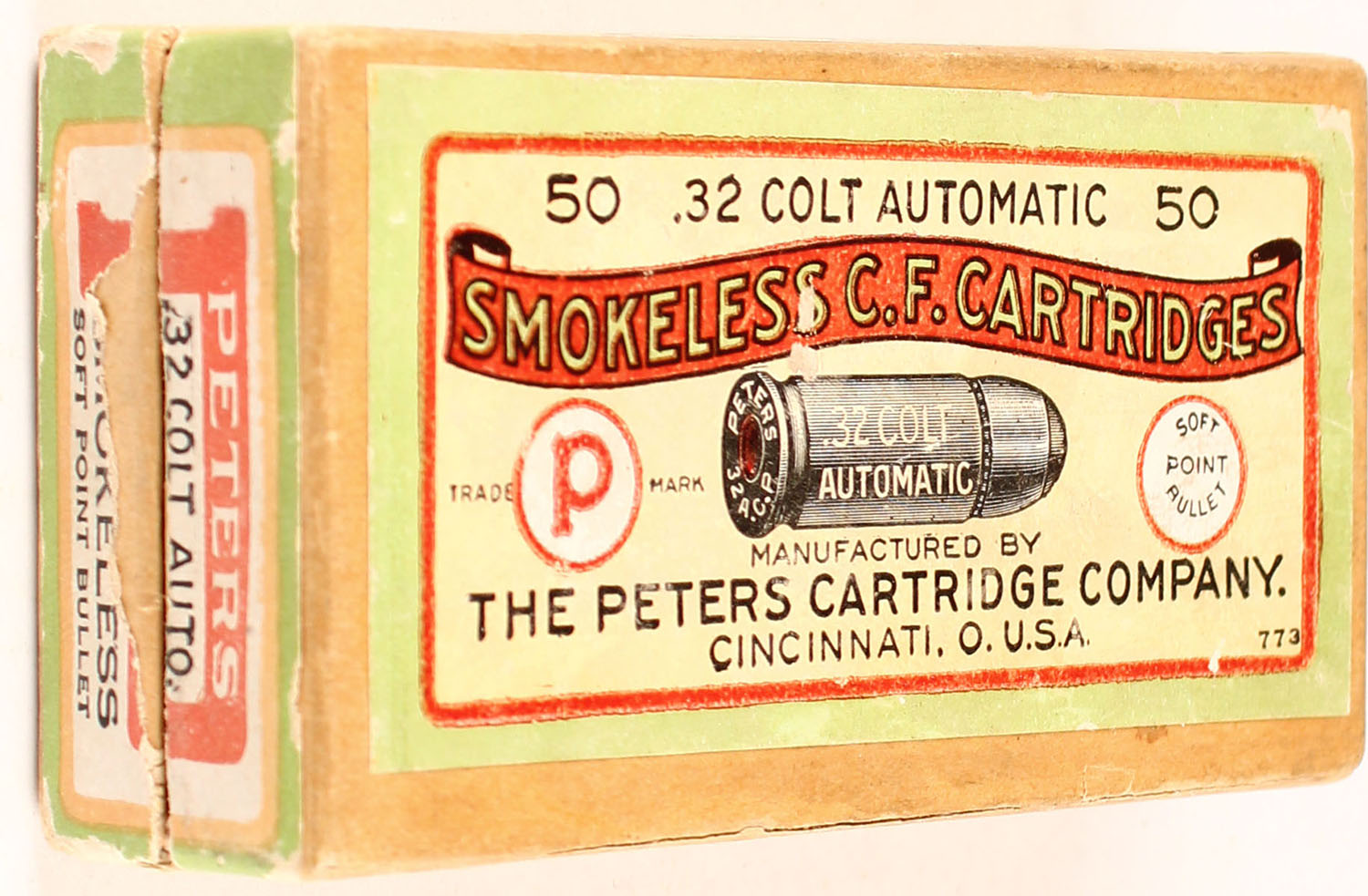 Peters, .32 Colt Automatic, Soft Point Bullets, smokeless, 2pc, Partial 47 Rds., buff box with buff/red/green label & black print, box is solid with small tear in left end label, light rub marks & light edge/corner wear, ammo is very good. Grade: Excellent + - Value: 20 to 60