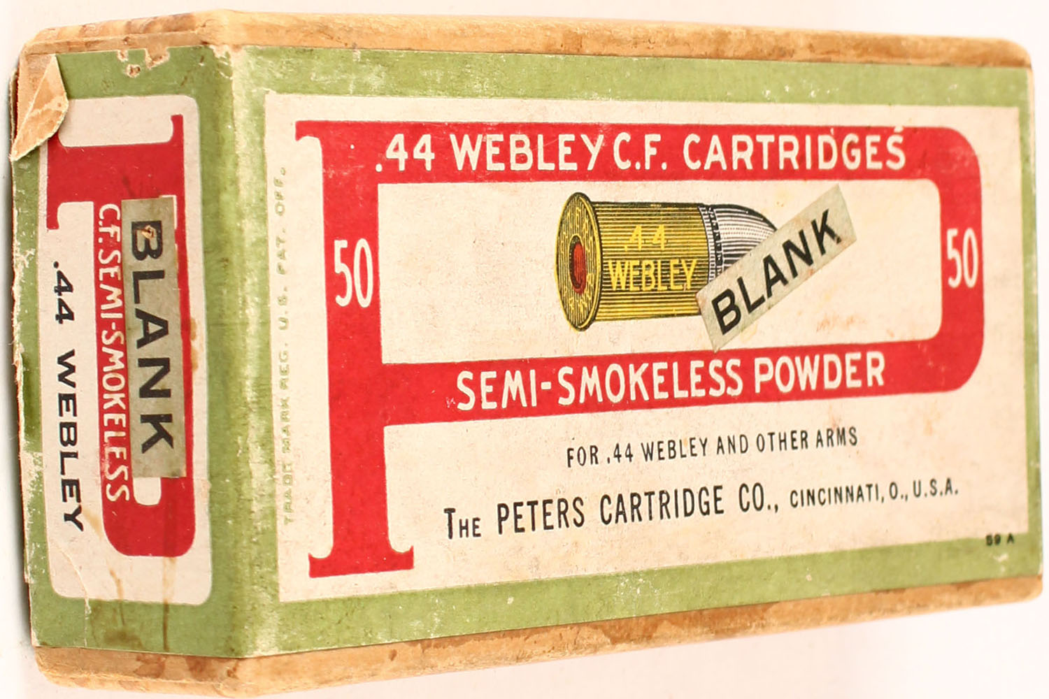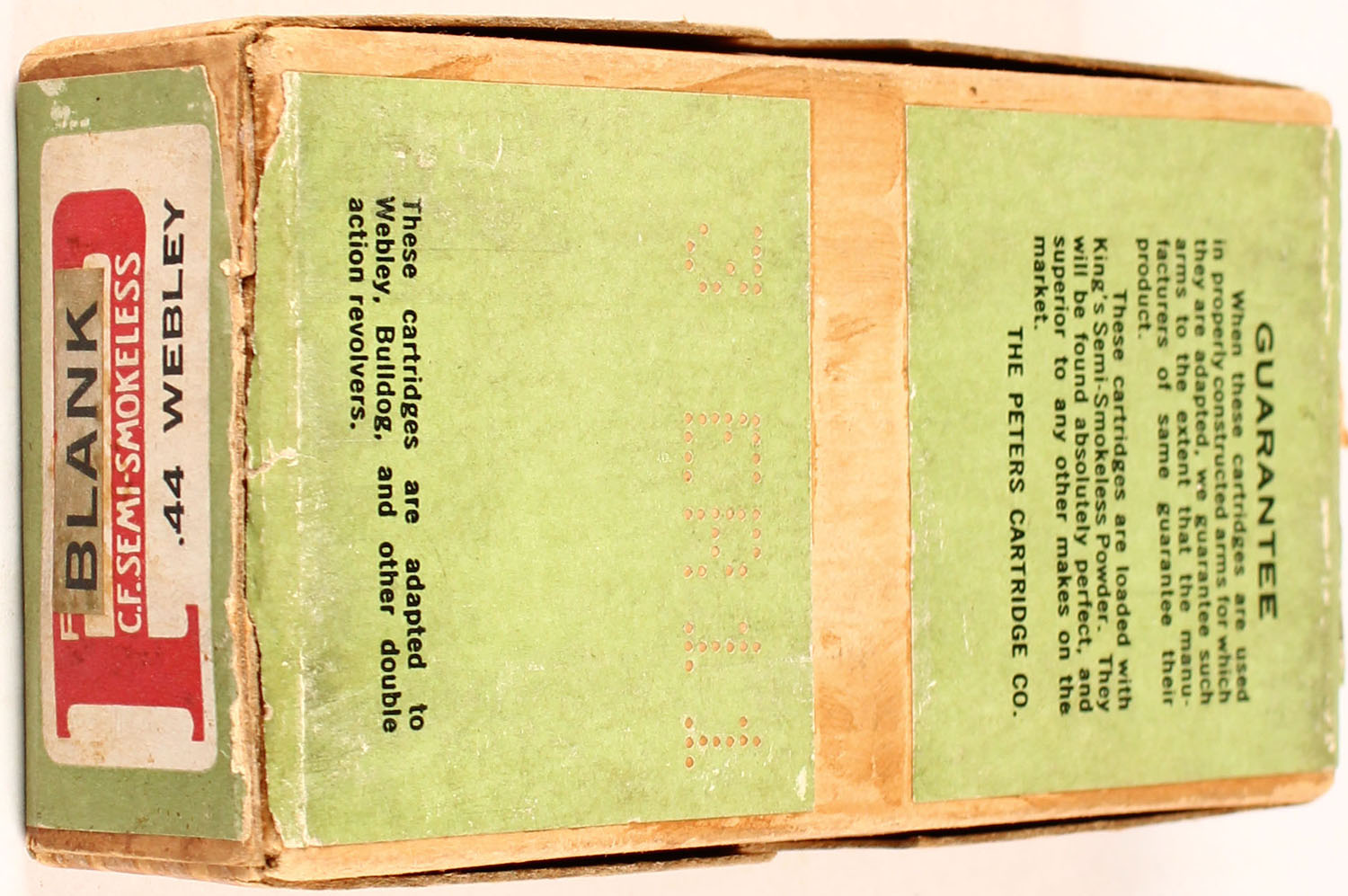 Peters, .44 Webley, OVERLABEL ''BLANK'', Semi-Smokeless Powder, 2pc, Full, buff box with green/white/red label & black print, box is solid with light age soiling, light rub marks, & light edge wear, ammo ranges from very good to good. Grade: Excellent - Value: 20 to 60