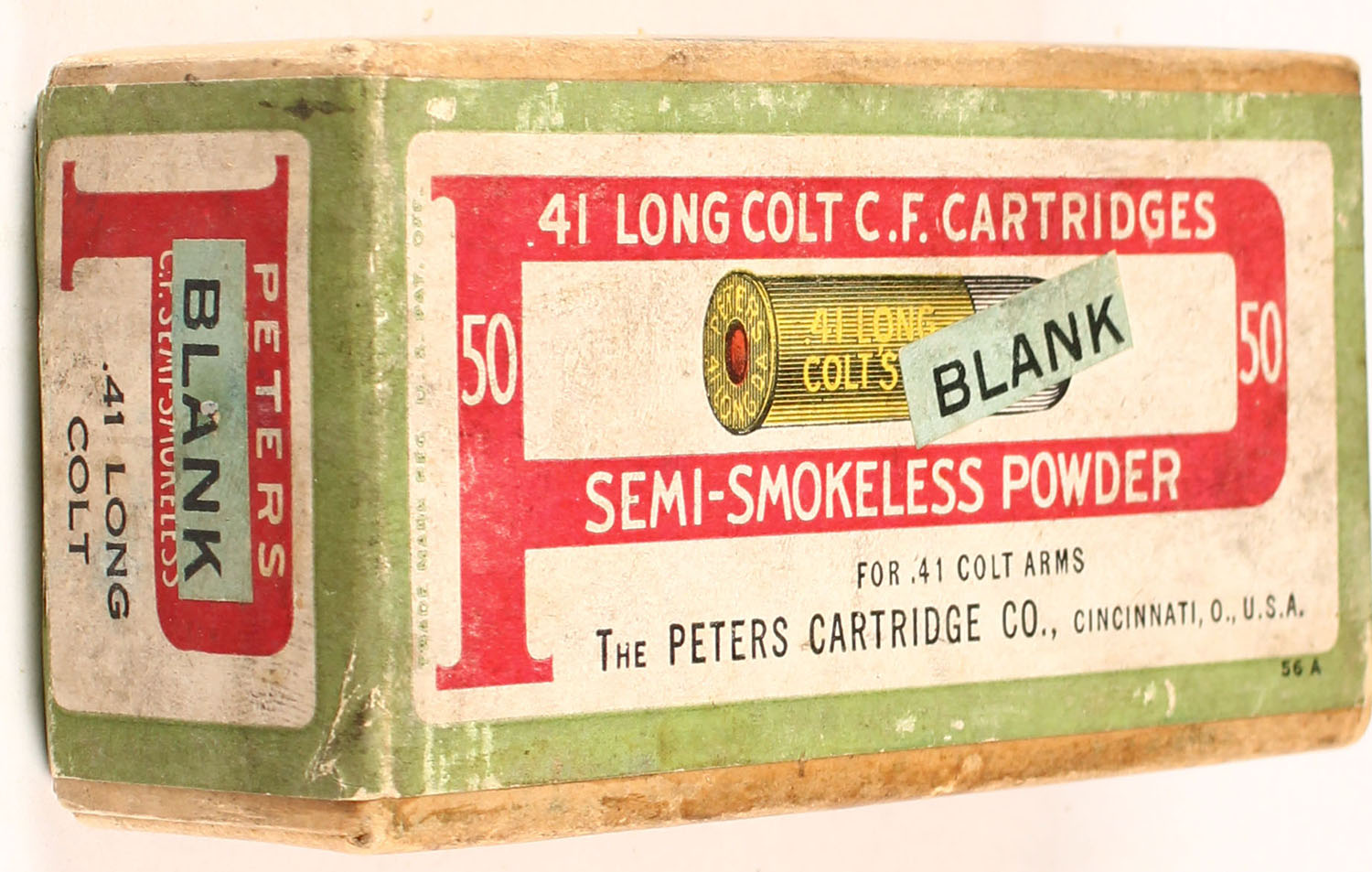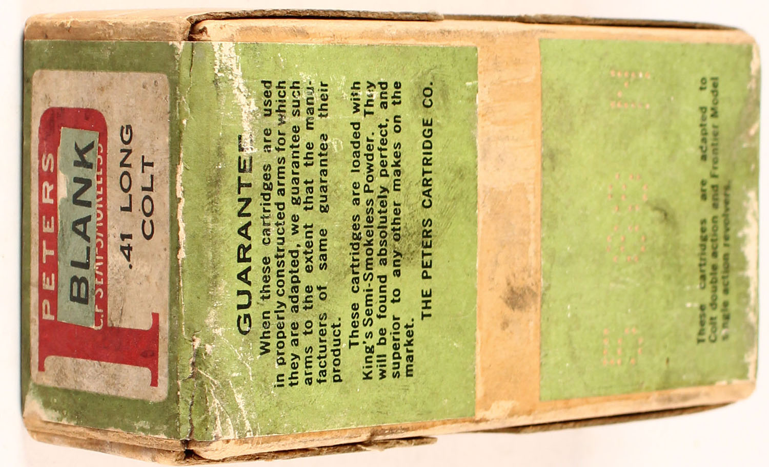 Peters, .41 Long Colt, OVERLABEL ''BLANK'', semi-smokeless powder, 2pc, FULL & SEALED, buff box with green/white/red label & black print, box is solid with age soiling, rub marks, & edge wear. Grade: Very Good ++ - Value: 20 to 60