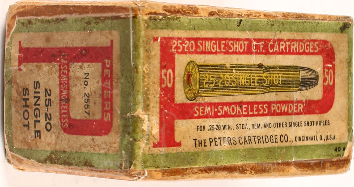 Peters, .25-20 Single Shot, Semi-Smokeless Powder, 2pc, Full, buff box with green/white/red label & black print, box is solid with tape all over box, light age soiling, light rub marks & edge wear, ammo is very good. Grade: Very Good - Value: 100 to 200