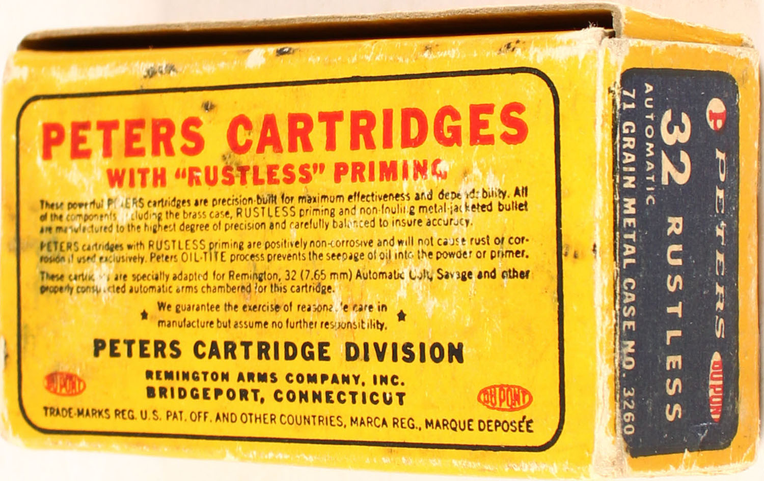 Peters, Rustless, .32 Automatic, 71 Gr. metal cased bullet, smokeless, 1pc Full, yellow box with blue/red label & white print, box is solid with factory seam that has come undone, rub marks, & edge/corner wear, ammo is very good. Grade: Very Good + - Value: 30 to 60