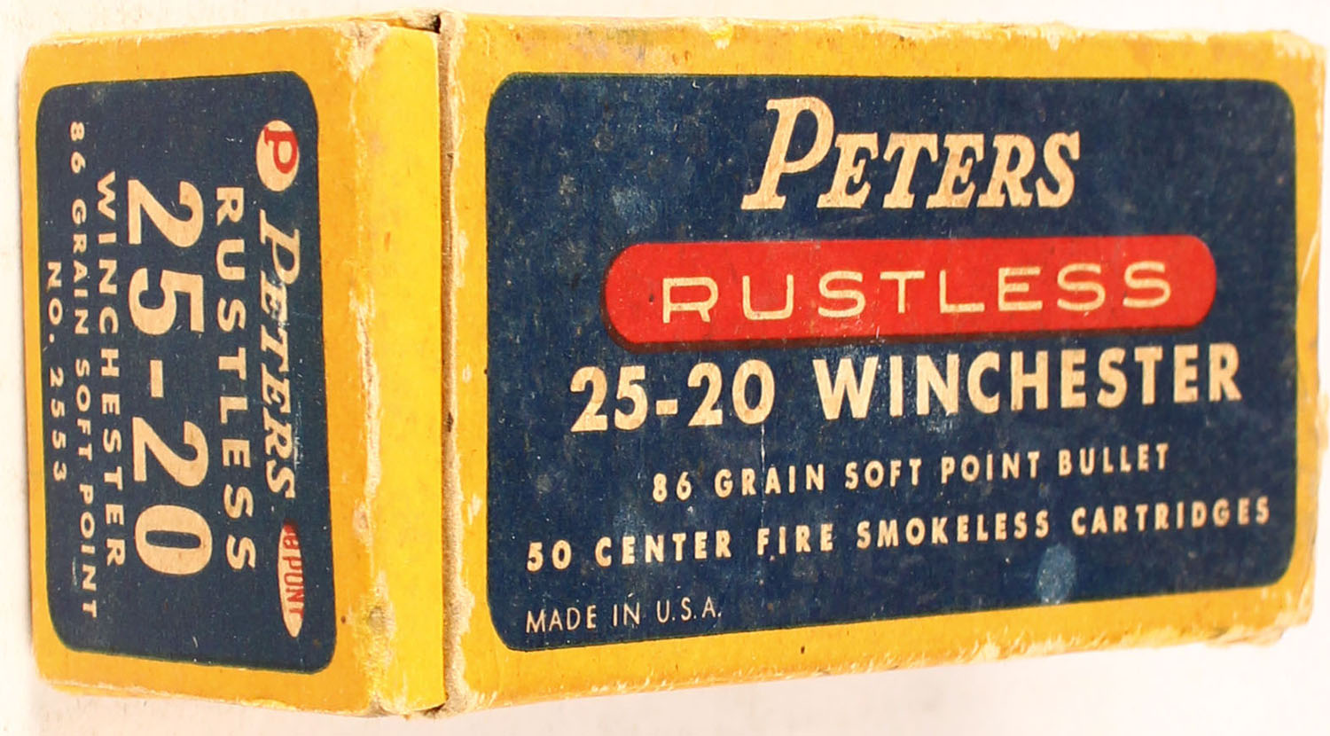 Peters, Rustless, .25-20 Winchester, 86 Gr. Soft Point Bullet, smokeless, 1pc, Full, yellow box with blue/red label & white print, box is solid with light age soiling, light rub marks, & edge/corner wear, ammo is very good. Grade: Excellent - Value: 100 to 200