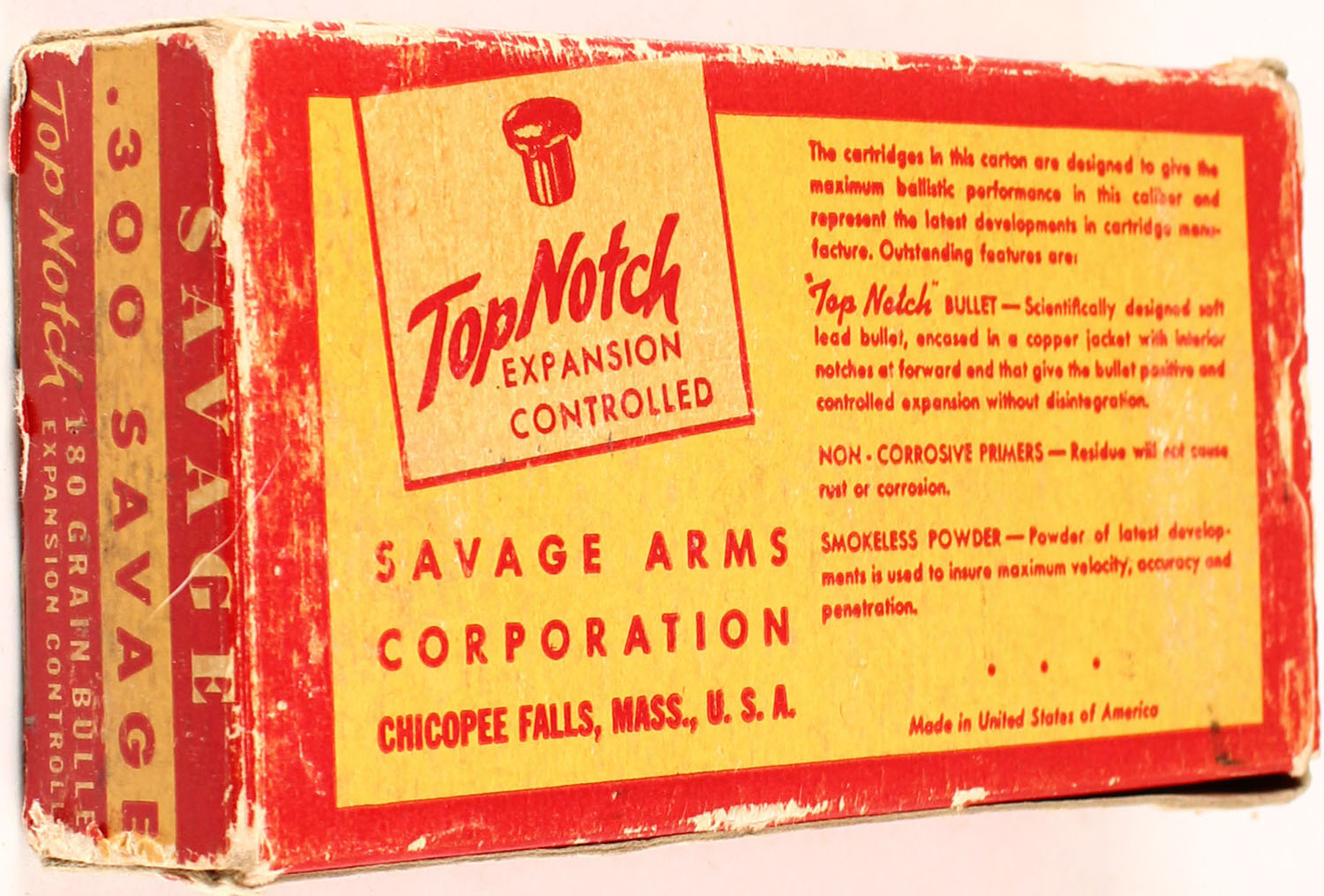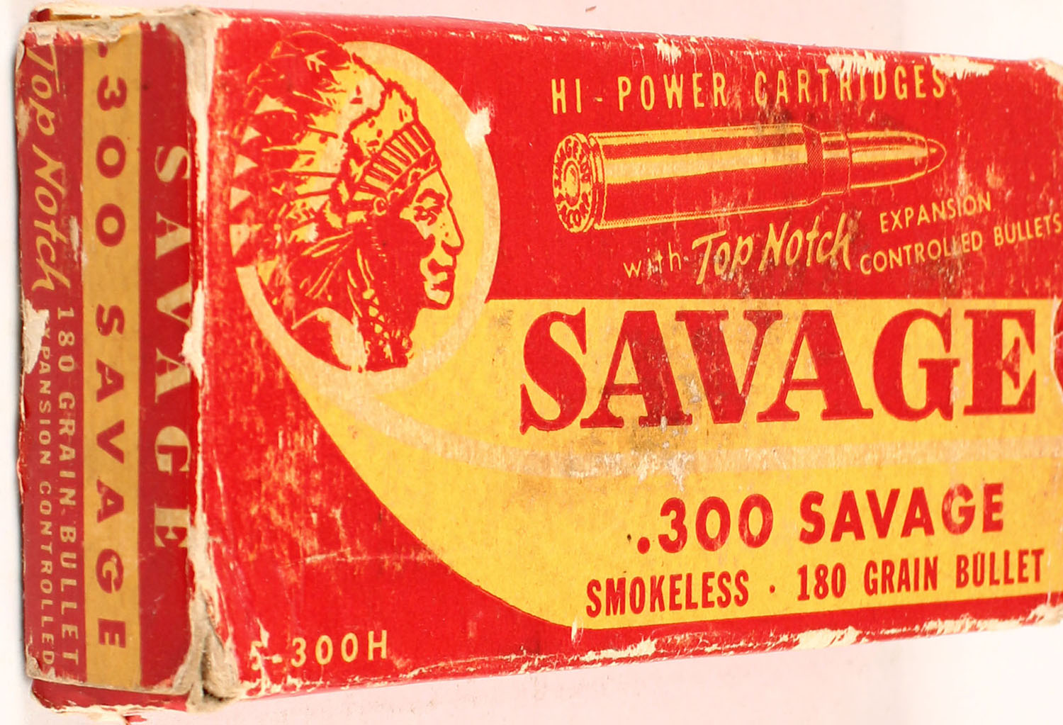 Savage, .300 savage, 180 Gr. Soft point expansion controlled bullet, smokeless, 1pc, Full, red box with yellow label & red/yellow print, box is solid with rub marks, & edge/corner wear, ammo is excellent. Grade: Very Good + - Value: 80 to 160