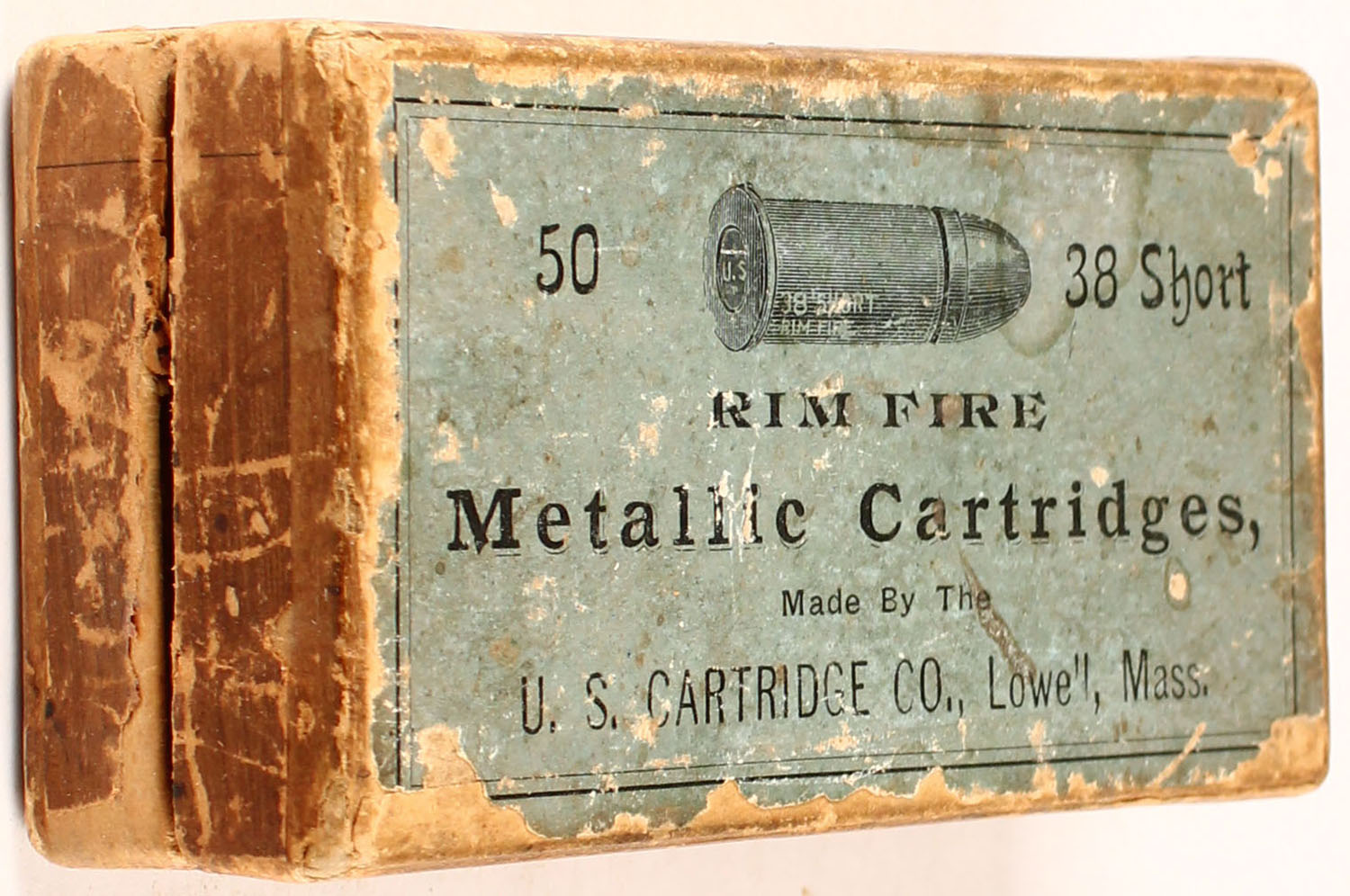 U.S. Cart. Co., .38 Short R.F., target cartridges, 2pc, Full, buff box with blue label & black print, box is solid with rub marks & edge/ corner wear, ammo is good. Grade: Very Good ++ - Value: 24 to 300