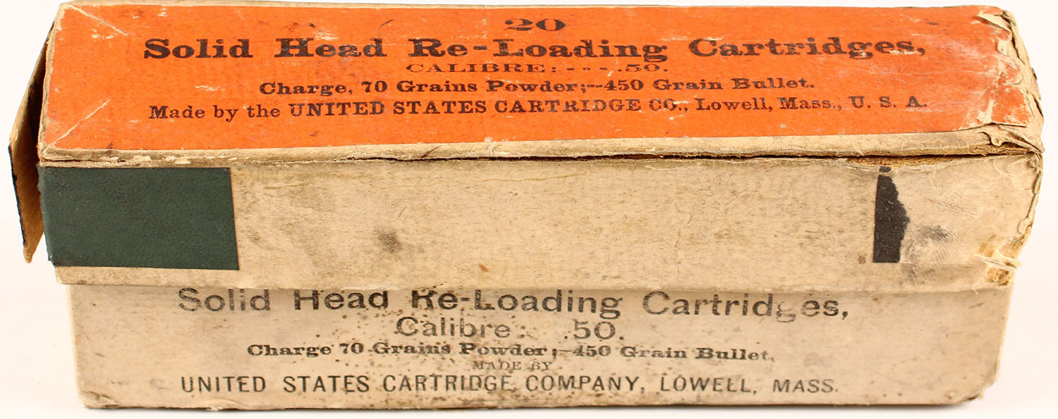 U.S. Cart. Co., .50-70-450, Solid Head Re-Loading Cartridges, 2pc, partial 6 Rds., buff box with orange label & black print, box has multiple split or partial split seams, tape seam repairs, right end of lid missing, light age soiling, & light rub wear, ammo is good. Grade: Very Good + - Value: 20 to 200
