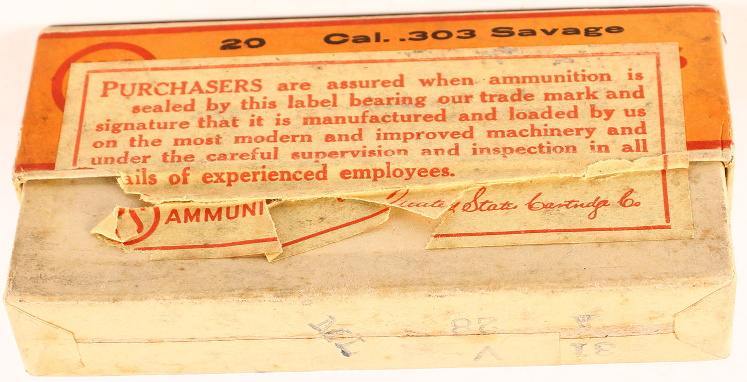 U.S. Cart. Co., .303 Savage, soft point cartridges, smokeless, DU PONT powder company paper inside, 2pc, Full, buff box with orange/red label & black print, box is solid with rub marks & light edge wear, ammo is very good with cracks on the necks of some cases. Grade: Excellent - Value: 50 to 300