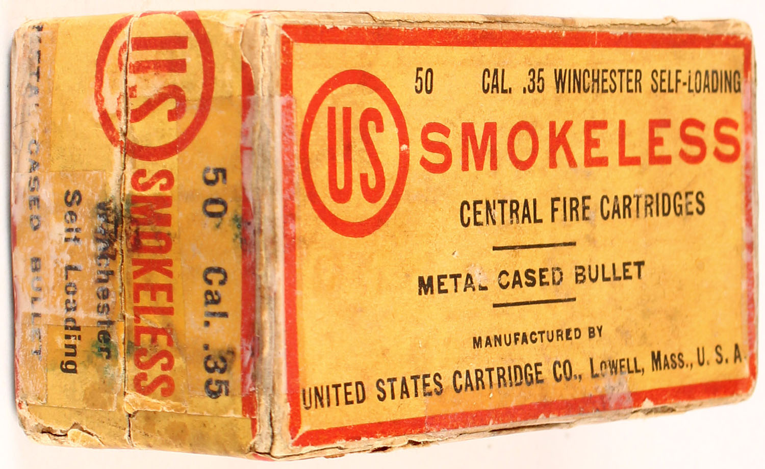 U.S. Cart. Co., .35 Winchester Self-Loading, Metal-Cased Bullet, smokeless, 2pc, Full, buff box with orange/red label & black print, box is solid with tape, light age soiling, light rub marks & light edge/corner wear, ammo ranges from good to fair. Grade: Very Good - Value: 80 to 160