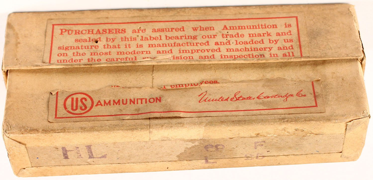 U.S. Cart. Co., .45-70 U.S. Gov't, OVERSTAMP ''BLANK'', Black Powder, 2pc, Full, buff box with blue label & black print, box is solid with factory black out lines on front label, age soiling, rub marks & edge/corner wear, ammo is good. Grade: Very Good ++ - Value: 10 to 40