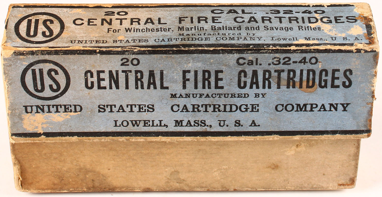 U.S. Cart. Co., .32-40, Black powder, 2pc, Full, buff box with blue label & black print, box is missing left end flap on lid, has one corner seam split on lid, age soiling, rust marks, rub marks & edge wear, ammo range from very good to poor. Grade: Good ++ - Value: 40 to 200