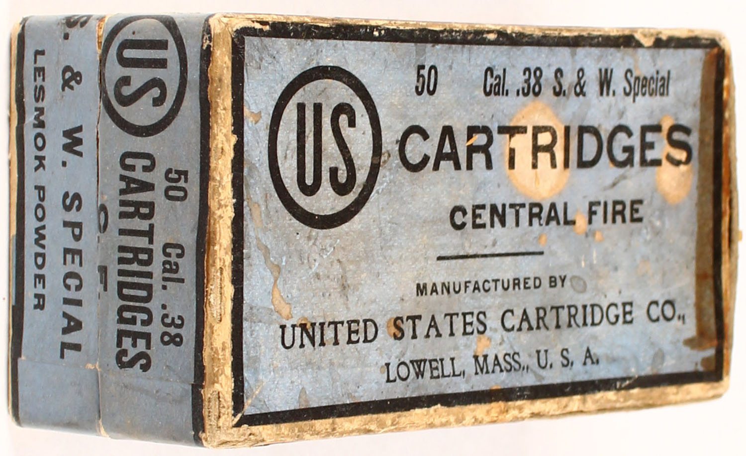 U.S. Cart. Co., .38 S. & W. Special, central Fire, Lesmok Powder, 2pc, Partial 49 Rds., buff box with blue label & black print, box has one split seam on lid, one partial seam on bottom, stains, age soiling, rub marks & edge wear, ammo ranges from very good to good. Grade: Very Good + - Value: 10 to 60