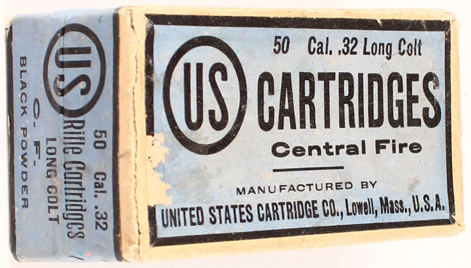 U.S. Cart. Co., .32 Long Colt, Central Fire, 2pc., FULL & SEALED, Black Powder, buff box with blue & black labels, box is solid with rub marks, light age soiling, & light edge wear. Grade: Excellent - Value: 40 to 160