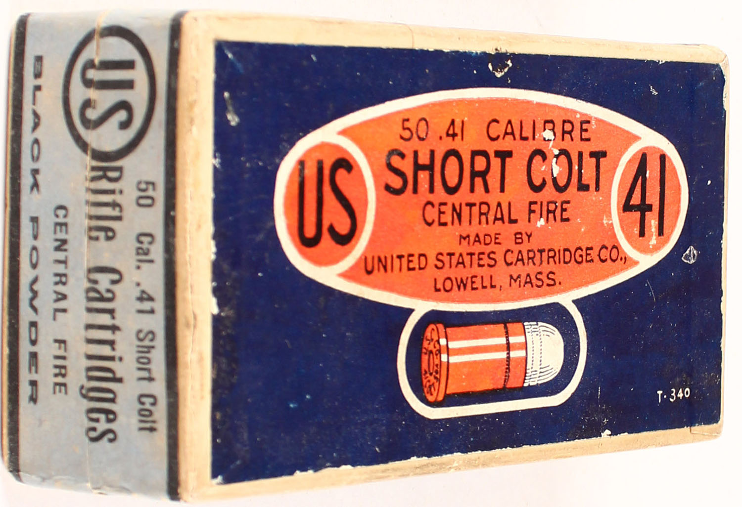 U.S. Cart. Co., .41 Short Colt, Black Powder, 2pc, Full, buff box with blue/orange label & black print, box is solid with pen marks on back, one split corner seam on lid, front side label seal still intact, light rub marks, & light edge/corner wear, ammo is good. Grade: Excellent - Value: 30 to 120