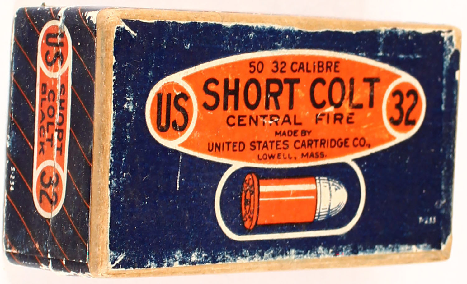 U.S. Cart. Co., .32 Short Colt, Central Fire, Black Powder, 2pc, Full, buff box with blue/orange/white label & black print, box is solid with rub marks & edge wear, ammo is fair. Grade: Excellent - Value: 50 to 150