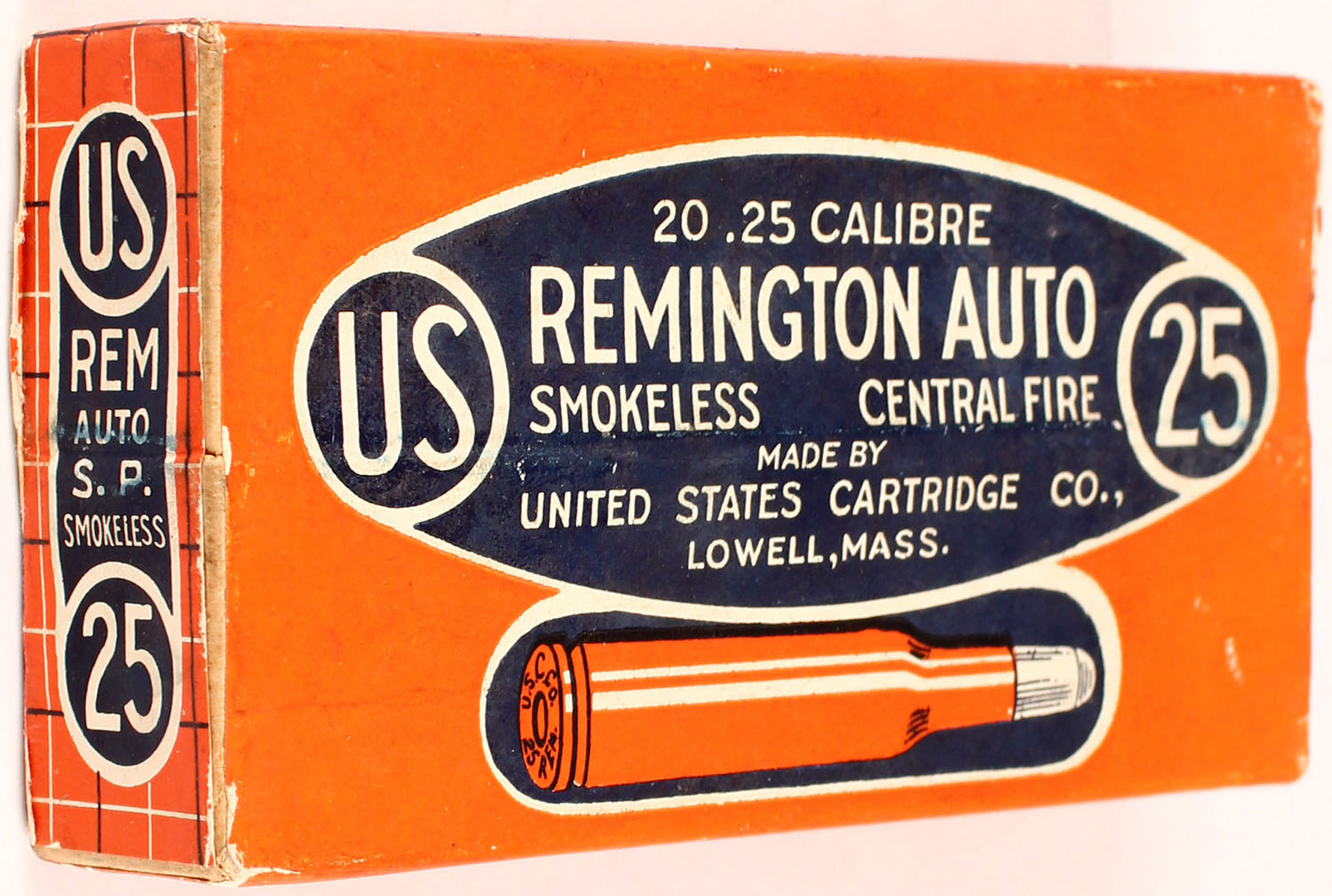 U.S. Cart. Co., .25 Cal. Remington Auto, Full & Sealed, 2pc. box is solid, orange, blue & white label has very minor age scuffing. Grade: Excellent + - Value: 75 to 250