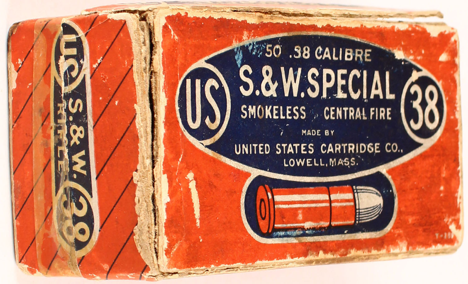 U.S. Cart. Co., .38 cal. S&W Special, Full, 2pc. Orange, white & blue labels, box has seam splits, scuffing and age soiling. Grade: Good ++ - Value: 20 to 80