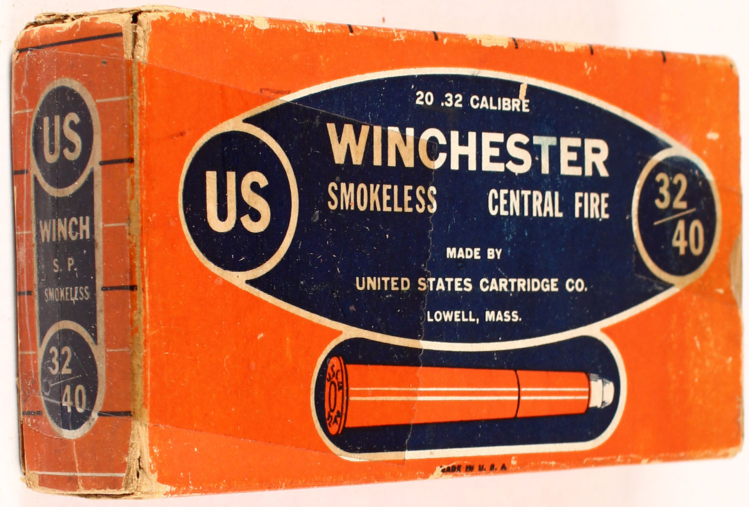 U.S. Cart. Co., .32 Winchester, Smokeless, Central Fire, 1pc, Full, orange box with blue/white box, box has both end flaps taped on, some scuffing and age soiling, ammo is very good. Grade: Very Good - Value: 20 to 80