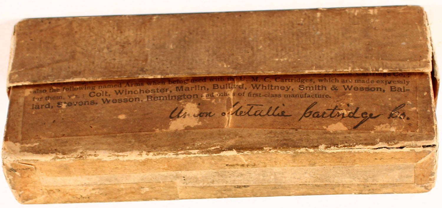 UMC, U.S. Springfield Carbine, .45 cal. Solid Head, Full, 2pc buff box with dark blue & black label, box and labels have age soiling, small seam splits and scuffing, ammo is excellent. Grade: Very Good - Value: 50 to 300